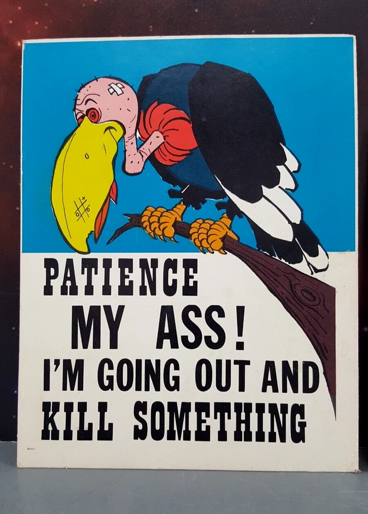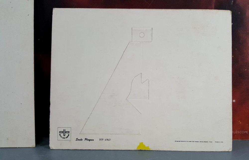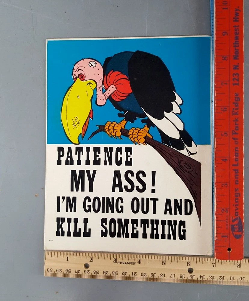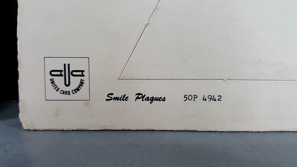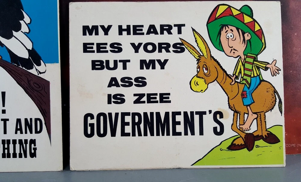UNITED CARD COMPANY SMILE PLAQUES CARDBOARD STAND UP SIGNS CARDS LOT 2 USA VTG Up for your consideration is this Very Unique LOT OF 2 Vintage United Card Company "Smile Plaques" made in 1967. These are made of thick cardboard / cardstock and have both the options of being hung or stood up for display. They are both in overall excellent vintage condition with bright graphics. The stand up legs have never been used or popped out from the back. One reads "My Heart Ess Yors But My Ass Is Zee Government's" with a man of Spanish descent on a donkey. The other card reads "Patience My Ass! I'm Going out and Kill Something" with an image of a vulture on a tree branch. These are really cool vintage signs and an extremely rare find, great for any collector. Please be sure to see all the other items we have listed. With over 1,800 items currently running and new ones added daily some people find more than one item that they may be interested in. If you like this and any other items we have, we often make custom listings, with a Quantity Discount AND Combined Shipping to save you money. Just send us a wish list to see what kind of awesome deal we can offer you. No obligation at all - if your not thrilled - you can just pass on it. FEATURES: True Vintage dated 1967. LOT OF 2. Printed by United Card Company in Rolling Meadows, IL USA. Bright and Colorful Graphics with funny phrases. Both measure 9x7. Can be hung on the wall or displayed standing up using the fold out stand. Overall Excellent Vintage Condition ADD. INFO: N/A INCLUDED: The actual LOT OF 2 Vintage "Smile Plaques" Cardboard Signs pictured. NOT-INCLUDED: No original box, packaging, or paperwork. No props used for size reference. BRAND: United Card Company LABEL: Smile Plaques DIMENSIONS: Each sign measures 7" wide x 9" tall. COLOR: Multi Colored Images and Black Lettering on White Cardboard TYPE: Collectible Signs, Smile Plaques, LOT OF 2 MODEL #: 50P 4911 and 50P 4942 COPYRIGHT DATE: 1967 CIRCA: 1967 COUNTRY: USA MATERIAL: Cardboard / Cardstock CONDITION: This LOT OF 2 comes to you in overall excellent vintage condition. As you can see in the pictures there is some wear around the edges and one of the signs has a small yellow spot on the back. Aside from that these are in excellent shape. The images are still bright and vibrant and the stand on the backs have never even been popped out. AUTHENTICITY and your SATISFACTION are UNCONDITIONALLY 100% GUARANTEED!!! Once you get it - if you are not thrilled just let me know - I gladly accept returns. Check my feedback and buy with complete confidence I have been selling on eBay everyday since 2001. SHIPPING DETAILS: The buyer pays for securely packed EXPEDITED shipping. It will include tracking and insurance. For premium services delivery to your address will usually take between 3 to 5 days. I will always combine shipping to save you money whenever possible, just email us to let us know. Please be sure to click on the shipping tab to compare rates and see all of the options available for shipping, some options cost less than others. SHIPPING CONDITIONS: *** Please Take Note!!! When paying we can ONLY ship to the address that is included with your payment . If you need it sent to a different address please change that PRIOR to making payment. We can no longer change the ship to address. LOC: B 2 #4 You really like the thing, but not so much the price... I find cool stuff, do some research and list it for what I think it's worth. Sounds pretty simple but sometimes not. So if this is something you really like but its a bit more than you had hoped to pay, then be sure to watch this because I can't send it to the bank, and if it ends without a buyer chances are good that I will drop the price and re-list it until it does sell! Two things for sure - it will get sold sooner rather than later, and that's better for both of us. International Buyers We will ship to most, but not all locations around the world. We use Priority Mail, and it will include full insurance and delivery confirmation. Unfortunately we do not ship using first class international mail because there is no insurance available. "Import Duties", "Tariffs" and "Taxes" are NOT included in the item price or shipping charges. These charges are imposed and collected by your country and are your responsibility. Please check with your country's customs office to determine what these additional costs (if any) will be prior to bidding/buying. These charges are normally collected by your customs office when you pick the item up or upon delivery ? please do not confuse them with shipping charges, they are not. Buyers using the Ebay Global Shipping Program will be shown these cost prior to purchase. We can NOT reduce the value on the "Customs Forms". The sales prices is automatically entered and also sets the maximum amount that the item can be insured for. We can not mark items purchased by you as "gifts". Some countries restrict or prohibit the import of certain items such as currency - jewelry or animal parts such as teeth, claws, horns or shells from many creature on the endangered specie list. The lists varies widely and changes often. It is your responsibility to check and make sure your country allows this specific item to be imported by you. We take a great deal of pride in our feedback rating and never want you surprised by anything you get from us. PLEASE If there is ever an issue, all we ask is that you give us an opportunity to address it BEFORE leaving feedback. Overall General Condition New Excellent Very Good Good Fair Poor Appearance Brand new and never used. No visible flaws in appearance. First quality, suitable for a gift. Like new condition. Upon close inspection some very minor signs of use or wear, but no serious flaws. Obviously used but kept in great conditional and well cared for. Expected normal signs of wear but no abuse. Clearly used allot, enough to cause significant signs of wear. See item description for more details 