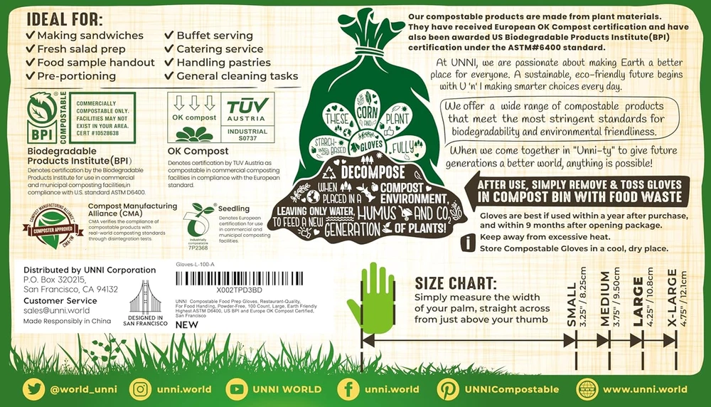 Store New Arrivals Add to Favorite View Feedback Contact UNNI Compostable Food Prep Gloves, Restaurant-Quality, for Food Handling, Powder-Free, 100 Count, Large, Earth Friendly Highest ASTM D6400, US BPI, CMA & Europe OK Compost Certified, San Francisco Description Age Range Description Adult Style Large Item Dimensions 10.98 x 6.34 x 0.98 inches Unit Count 100.00 Count Brand Name UNNI Brand UNNI Material compostable Model Number Gloves-L-100 Model Name Gloves-l-100 Hand Orientation Ambidextrous Material Type Free Powder Free Reusability Disposable Closure Type Pull On Water Resistance Level Waterproof Item Weight 4 ounces Special Features Eco Friendly Special Feature Eco Friendly Color Green Material Features Compostable, Biodegradable Is Waterproof True Recommended Uses For Product For Food Handling Size 100 Count (Pack of 1) 100 Count; Large = 4.25" / 10.8cm; Size Chart: Simply measure the width of your palm, straight across from just above your thumb Ideal for: Making sandwiches, Fresh salad prep, Food sample handout, Pre-portioning, Buffet serving, Catering service, Handling pastries, General cleaning tasks CERTIFIED COMPOSTABLE IN U.S. & EUROPE: Certified by the Biodegradable Products Institute (BPI) under US standard ASTM D6400. Certified OK Compost under European standard EN 13432 by Vinçotte and Tüv Austria. OK Compost certification guarantees 100% BIODEGRADABILITY IN COMPOSTING facilities. Compost Manufacturing Alliance (CMA) Approved: CMA verifies the compliance of UNNI compostable products with real-world composting standards through disintegration tests. HIGHEST BIOBASED CONTENT: UNNI Compostable Bags are made from plant starches and contain NO polyethylene. Bags are durable, nontoxic, easy to use and great for the environment. UNNI compostable bags are the ethical choice for a cleaner environment and an ECO-FRIENDLY future. Thank you taking care of our planet for FUTURE GENERATIONS by replacing plastic with our sustainably manufactured, compostable bags. Together, U ‘n’ I make Earth a better place. Product Description Denotes certification by TÜV Austria as 100% compostable in backyard and home composting units. OK Compost Home is one of the world’s only home composting certifications. US BPI Denotes certification by the BPI for use in commercial and municipal composting facilities, in compliance with U.S. standard ASTM D6400. At UNNI, we are passionate about making Earth a better place for everyone. A sustainable future begins with U 'n' I making smarter choices every day. When we come together in "Unni-ty" to give future generations a better world, anything is possible! We offer a wide range of 100% compostable products that meet the most stringent standards for biodegradability and environmental friendliness. Our compostable bags are made from plant materials and have received European OK Compost Home certification, so they are 100% compostable even in home composting units These bags have also been awarded US BPI certification under the ASTM #6400 standard, and can be composted in municipal and industrial facilities. ABOUT US We offer the best prices around on high quality products. Our E-store includes media such as books, movies, music and games while offering electronics, toys, sporting apparel, clothing, tools, general home, garden items and more. SHIPPING We are always working hard to ensure your package arrives as soon as possible. Please understand that some factors like weather, high postal traffic, and the performance of shipping companies are outside of our control. We offer free shipping to the lower 48 states and ship within 2 business days of payment, usually sooner. We do not accept P.O. Boxes. Please provide a physical address. RETURNS We offer a 30-Day Return Policy on items which you are not completely satisfied with. You have the option for a full-refund or an exchange of the item. No returns are available on items shipped outside of the USA. PAYMENT We accept PayPal. CONTACT US This page content is yet to come Please ad us to your favorite seller and visit again later Thank You CUSTOMER SATISFACTION We try our very best to make sure every customer is completely satisfied. If there's a problem, message us! We're happy to help.