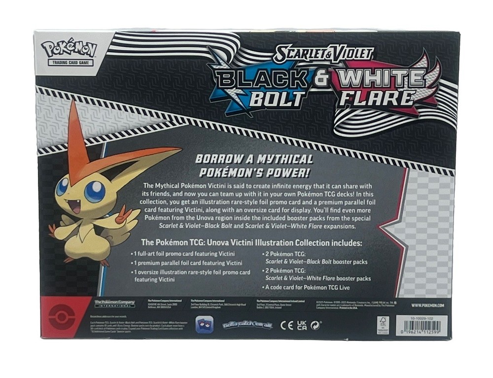 The UNOVA VICTINI ILLUSTRATION COLLECTION is a sealed collectible card game set from the Pokémon TCG Scarlet & Violet series, featuring the character Victini. Manufactured by Nintendo in 2025, this box contains one set of standard-sized cards in English language. This special promo set is suitable for ages 6 and up, making it a desirable item for fans and collectors alike. The black bolt and white flare illustration adds a unique and visually appealing touch to this sought-after collection.