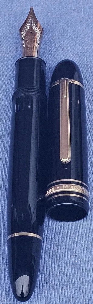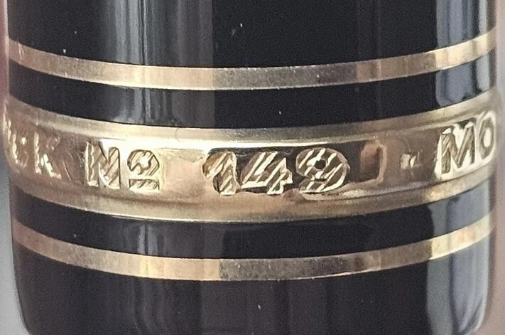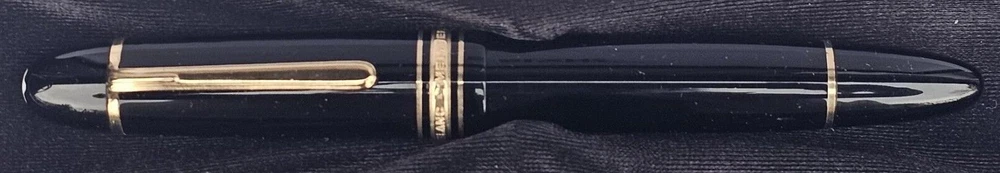 This auction is offering an Elegant, Unused Mont Blanc Meisterstuck #149 Diplomat Fountain Pen. This pen features a 14K / 585 Gold Nib numbered 4810, a piston style filling system, a precious black color resin with a gold-plated clip and rings. This is an early model circa the 1980's. The middle ring is embossed with: "MONTBLANC MEISTERSTUCK 149." It measures 5-3/4 inches with the cap attached, or 5.1 inches when being used for writing. The pen has remained in excellent condition, no wear or damage. The original presentation box is also included along with the Montblanc service guide booklet. A fine example. Questions are welcome.