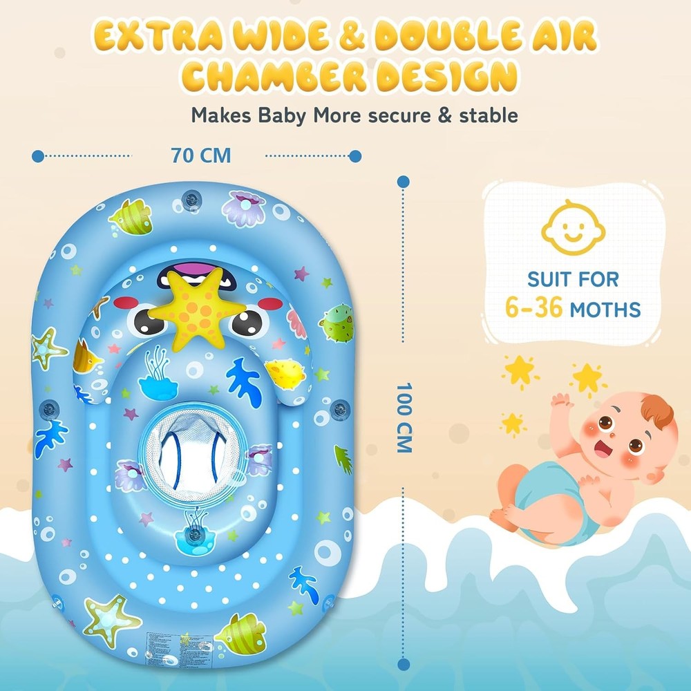 Free eBay listing template designed by dewiso.com Baby Float with Canopy- UPF50+ Sun Protection Baby Pool Float,Inflatable Kids Pool Float with Adjustable Safety Seat for 6-36 Months Kids Kiddie Boys Girls Swimming,with Marine Animal Floating Toys FREE AND FAST SHIPPING! About this item PREMIUM SAFETY DESIGN: Our Baby Pool Float with Canopy, designed for ultimate safety, the dual air chambers and widened sides provide superior buoyancy and stability, never flips over and keeps baby safely centered. NON-TOXIC CERTIFIED & SKIN-FRIENDLY MATERIAL: CPC certified for safety and comfort, this Baby Pool Float with Canopy, is made of 100% non-toxic PVC material, ultra-soft baby-friendly material gently cares for tender skin, and seamless edges eliminate the risk of abrasion. UPF50+ SUN PROTECTION TOP: The sunshade of this baby floatation bed can be adjusted from 0-120° to protect your baby from harmful UV rays, and the removable wide-rimmed sunshade provides a full-angle customized design to keep the sun out of your baby's eyes during poolside play or beach trips. VERSATILE SEA-THEMED FUN: Designed for infants and toddlers, the Baby Pool Float with Canopy makes every swim an amazing journey! Featuring playful starfish toys and brightly colored sea life patterns, this versatile baby float turns pool time into an imaginative underwater adventure. ULTRA PORTABLE AND EASY TO SET UP: Our baby pool float toys are perfect for outdoor pool toys, the beach, indoor bathtubs, or your child's water recreation. This lightweight baby pool float toy inflates/deflates in minutes and folds compactly into its included storage box. Product We offer a 30-Day Return Policy on items which you are not completely satisfied with. You have the option for a full-refund or an exchange of the item. No returns are available on items shipped outside of the US . Shipping We offer Free Shipping to the US and ship within 2 business days of payment, usually sooner. We use UPS express shipping. That's why your products are usually delivered within 3 days . Contact We try our very best to make sure every customer is completely satisfied. If there's a problem , message us! We're happy to help. 24/7 live chat available.