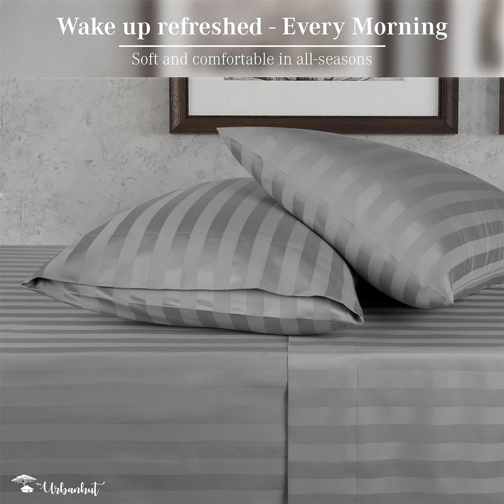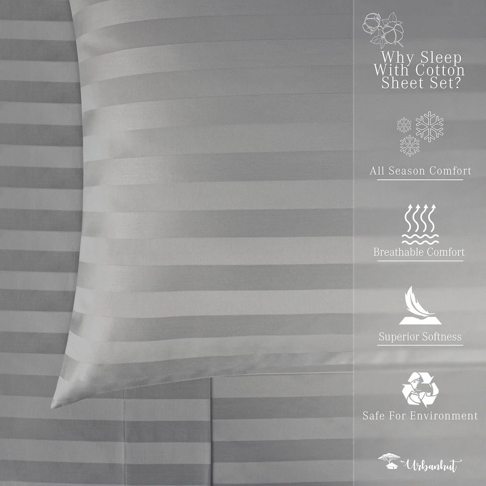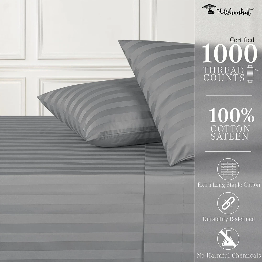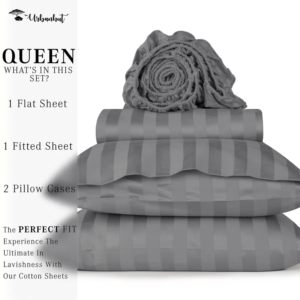 Experience Luxury Cotton: Immerse yourself in luxury with our 100% pure cotton Striped sheets, boasting 1000 threads per square inch. The sateen weave and long-staple cotton yarns deliver the ideal blend of breathability and durability, perfect for night sweats and ensuring a silky-soft feel akin to 5-star hotel bedding. Perfect Fit with Elastic Deep Pocket: Enjoy year-round comfort with our heavy and breathable Queen sheet set, designed to keep you cool in summer and cozy during winter. Each 4-piece Queen sheet set includes 1 flat sheet (91" X 102"), 1 fitted sheet (60" X 80" ), with a 16" deep pocket, and 2 pillowcases (21" X 32"). The all-around elasticized deep pocket ensures a snug fit without bunching. Crafted for High Quality & Longevity: Urban Hut premium bedsheets resist fading and become softer with each wash, offering a lifetime of comfort. Each sheet is individually measured and stitched to guarantee maximum comfort and durability. They undergo rigorous testing for color fastness, minimum shrinkage, and no pilling, ensuring superior smoothness. Certified Green Weaving & Dyeing: We take pride in our commitment to eco-friendly practices. Our sheets are made using certified green weaving and dyeing techniques. All dyes, auxiliaries, and sheets are OEKO-TEX certified, ensuring safety and sustainability. Our manufacturing facilities use renewable energy sources like windmills, and we implement rainwater harvesting methods to minimize our environmental footprint. Commitment to Our Customers: Our commitment to your satisfaction goes beyond comfort and luxury. We are fully devoted to serving our customers with the utmost care and attention, thanks to our 30-day return policy. Gift our high-quality sheets to your loved ones or enhance your room decor with bespoke luxury.
