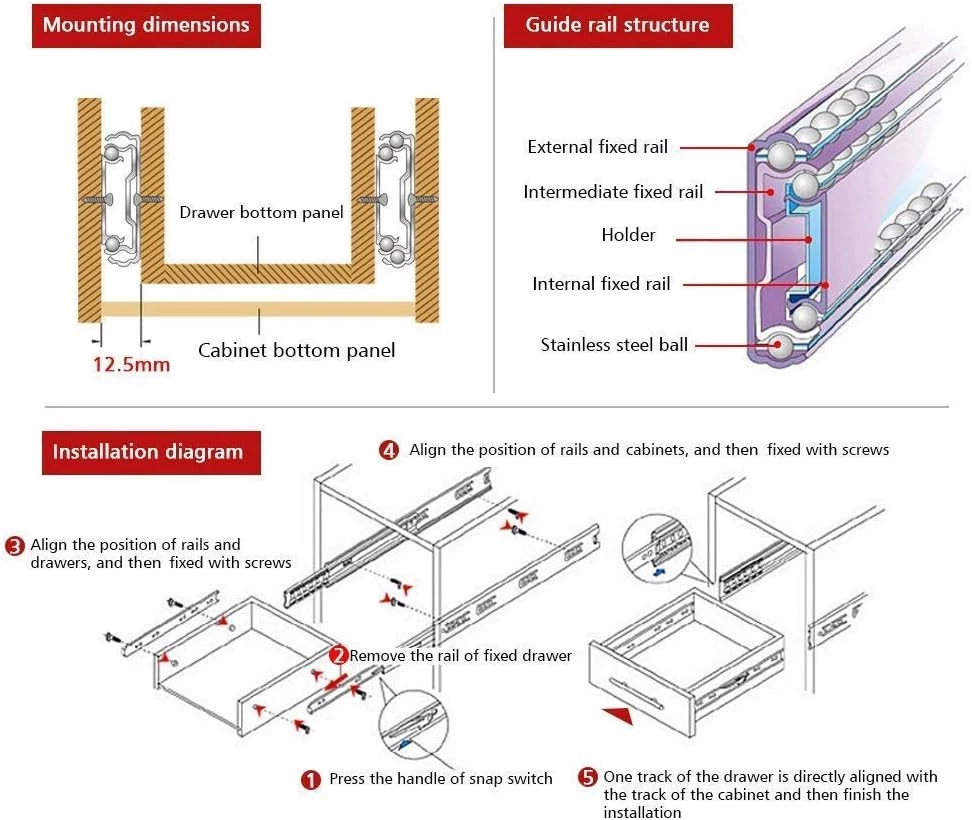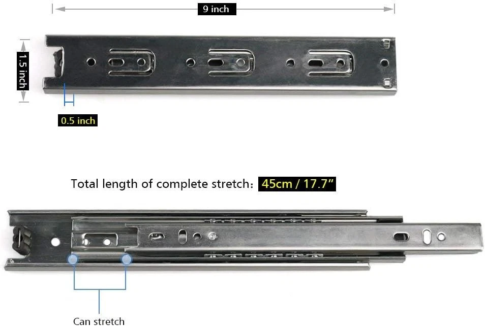 URBEST Drawer Slides 9 Inch Full Extension 3 Sections Ball 9Inch, Silver Product Details Mounting Type: Side Mount Drawer Type: Storage Manufacturer: URBEST Number of Items: 2 Part Number: L31 Item Weight: 12.3 ounces Product Dimensions: 9 x 0.5 x 1.5 inches Item model number: L31 Is Discontinued By Manufacturer: No Size: 9Inch Finish: Stainless Steel,Steel Shape: Rectangular Item Package Quantity: 1 Batteries Included?: No Batteries Required?: No Color: Silver Material: Stainless Steel Brand: URBEST Product Dimensions: 9.06"L x 1.54"W x 0.5"Th Finish Type: Stainless Steel,Steel Product Name : Ball Bearing Drawer Slides; Feature : 2 Pcs, 3-fold Smooth Telescopic Slide; Material : Cold-rolled Steel with Steel Ball Bearings Application: cabinets, desk pedestals and general storage drawers Notice: Installing screws are not included here. Package Include: 2 Pcs stainless steel drawer slide 3 sections