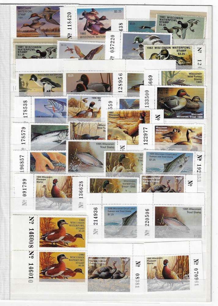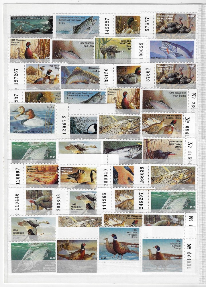 US 1978-2000 WISCONSIN STATE DUCK & TURKEY HUNTING COLLECTION OF 100+ STAMPS MINT NEVER HINGED WITH NUMBERS IN MARGINS; INCLUDES SOME TROUT FISHING STAMPS HIGH FACE VALUE PLEASE VISIT MY EBAY STORE : Filatco Stamps BUY 5 ITEMS SHIPPING & REGISTRATION IS FREE INTERNATIONAL BUYERS PLEASE NOTE: EBAY AND PAYPAL REQUIRE REGISTRATION FOR TRACKING INTERNATIONAL SHIPMENTS. EBAY CHARGES $12.61 FOR SHIPPING LABELS WITH TRAKING # US POST OFFICE CHARGES $14.95 FOR REGISTRATION # + POSTAGE BUYER HAS THE CHOICE OF SHIPPING FIRST CLASS MAIL WITHOUT TRACKING # FOR $2.50 . IN THIS CASE BUYER ACCEPTS RESPONSIBILITY IF ITEM IS LOST IN TRANSIT. Feel free to ask if you have any questions. PAYMENT WITHIN 2 DAYS IS APPRECIATED . FEEDBACK : I APPRECIATE YOUR BUSINESS AND MY TOP CONCERN IS TO MAKE SURE YOU ARE 100% PLEASED WITH ANY ITEM YOU PURCHASE. IF YOU HAVE A CONCERN OR A PROBLEM WITH INVOICE, SHIPPING OR ANY ITEM YOU RECEIVED PLEASE CONTACT ME FIRST BEFORE YOU LEAVE ANY FEEDBACK. I GUARANTEE YOU WILL BE 100% SATISFIED WITH THE TRANSACTION. I WILL CERTAINLY LEAVE YOU A POSITIVE FEEDBACK AS SOON AS I RECEIVE YOURS.