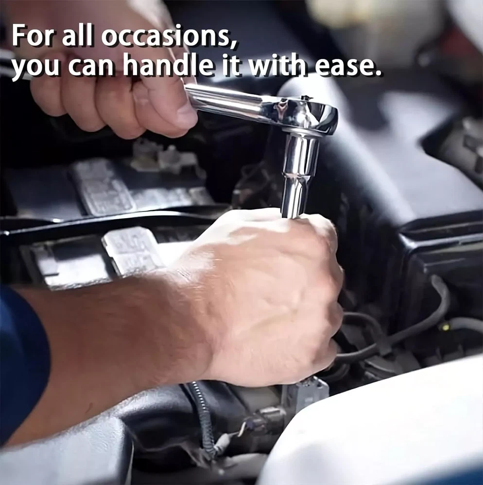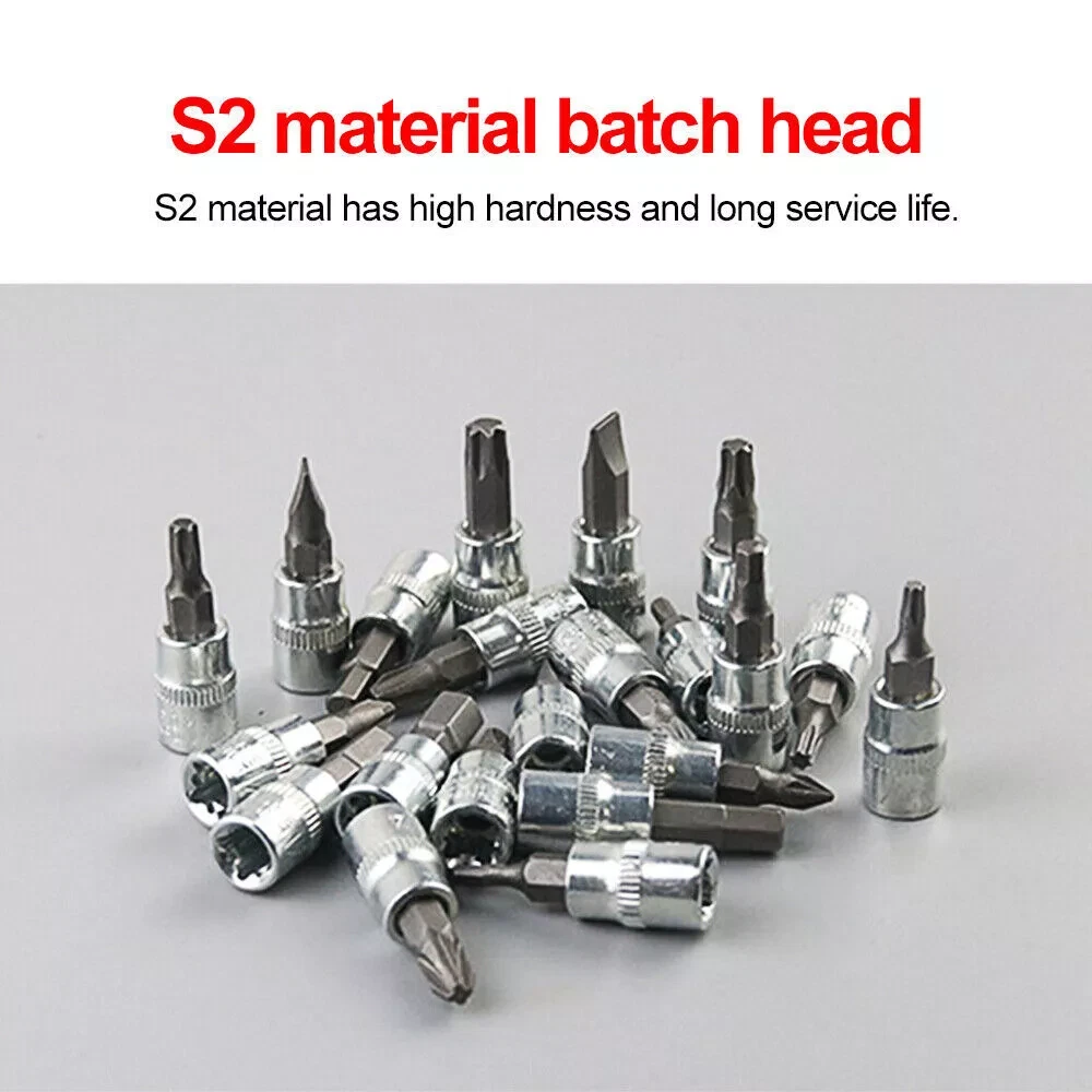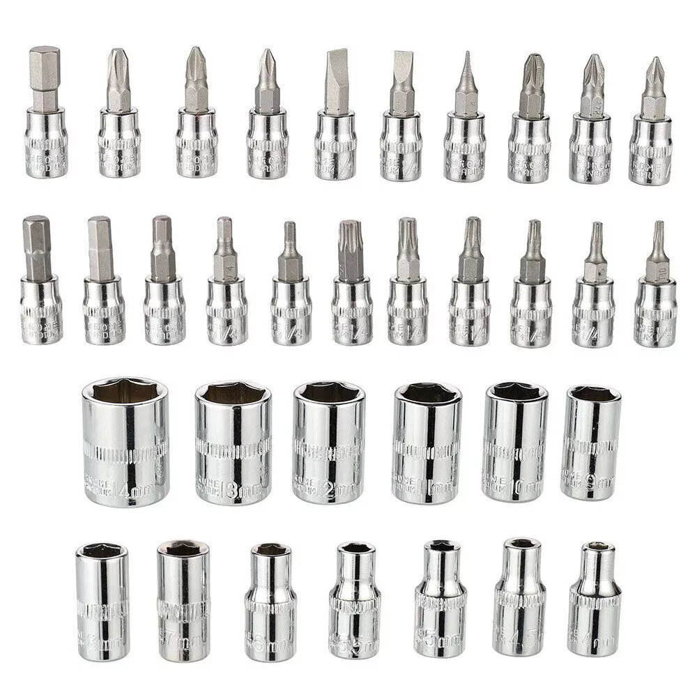 About this item HIGH QUALITY: The socket, screwdriver bit and wrench set are made of high-quality chrome vanadium steel for longer service life. All tools are highly polished and chrome plated. Durable Design: The locking ball design on the head of the extension can easily tighten and loosen the socket. Perfect for tradesmen, tradesmen, construction workers, mechanics, auto bike mechanics and more. Comprehensive Socket Kit: Comes with ratchet and extension rod, screw handle and socket converter. Switchable Ratchet Wrench: The included switchable ratchet has 72 fine teeth and a two-part handle provides more grip. You can quickly change the direction of the screw using the lever on your head. The ball lock ensures the nut is securely fastened. Specification: Number of tools: 52 pieces (46+6 pieces) Toolbox color: green 21-piece set of socket drill bits: -6 standard hex drill slots (#3, #4, #5, #6, #7, #8) -6 Allen key inserts (T10, T15, T20, T25, T30, T40) -3 slots for Pozidriver bits (#1, #2, #3) -3 slots for flat screwdriver bits (#4, #5.5, #7) -3 Phillips screwdriver slots (#1, #2, #3) 6-Piece Drill Bit Replacement Parts with Additional Socket: Allen key (T10) Standard hexagonal drill groove (#3, #8) Pozi screwdriver slot (#1) Slotted screwdriver bit (#4) Slot for Phillips screwdriver bit (#1) 13 1/4" hex socket: 4mm, 4.5mm, 5mm, 5.5mm, 6mm, 7mm, 8mm, 9mm, 10mm, 11mm, 12mm, 13mm, 14mm special function: - Push-button ball bearing quick release mechanism for quick and easy sleeve replacement. -Ideal for homes, garage workshops, metal/wood workers, construction workers, auto mechanics, hobbyists as well as DIY enthusiasts, professionals and more. -The axles are locked and equipped with two comfortable handles as well as forward and reverse switches and quick release buttons. -Black oxide protects drill bits from corrosion - Smooth, polished steel socket end allows for quick cleaning - With integrated push-button control, the ratchet is quickly ready for use -High tensile strength steel structure ensures strong torque - Precision cut screwdriver tip reduces chipping packing list: Socket wrench insert * 27 Hexagonal wrench*3 1/4 inch hex socket*13 1/4 inch quick release ratchet wrench*1 1/4" universal joint*1 1/4 inch flexible column*1 1/4" slider*1 1/4" short column*1 Extension column*1 Pop-up window*1 Interface small square rod*1 Toolbox*1