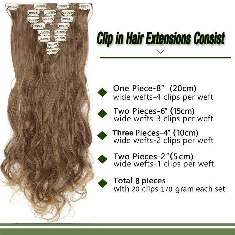 tracy.hair The S-nolite Hair clip in extensions instantly transform your hair while making you to feel your most confident with beautifully long, flowing hair. S-nolite Hair Clip-in hair extensions are made with the highest quality, Soft Synthetic hair. Available in the widest range of colors, length and weight, they blend naturally with your own hair and can be diy styled. The 8 Pieces Hair is the Most Popular 8 in 1 Clip in Hair Extension set. At 170g 17"-26", it is thickest and largest set ever! Transforming your look in seconds, provides secure and comfortable attachment for all day wear. The perfect set to create all those envious ponytails, buns, side braids and so much more! Specifications: Material: Heat-Resisting Fiber Color: Dark Brown, Blonde, Black, Light Brown Mix, Ombre and ect. Size: 17" curly/23" straight/24" curly/26" straight Texture: Curly/straight/wavy Occasion: Daily use, party, wedding, prom, club and etc. Advantage * Making fine hair look THICKER * Making your hair look LONGER * Updating your style * Adding some colour/highlights * Creating a glam different look for that special day or night out * Covering thinning hair