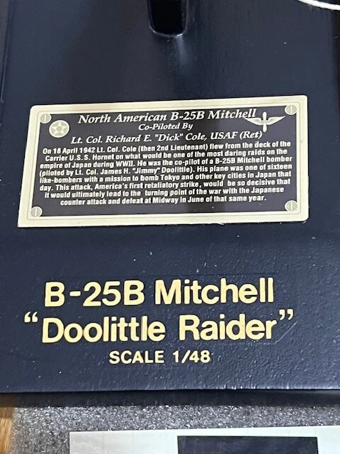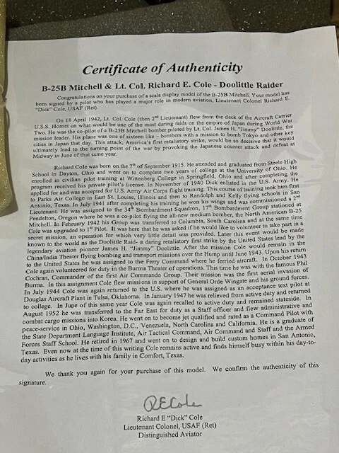 US Army B-25B Mitchell Doolittle Raid Richard Cole Signed Desk Model 1/48 NEW BRAND NEW - Never Displayed !! Please see Pics You will receive the Signed ON PLANE Signature along with the Letter of Authenticity and Picture of Mr. Coler signing. Please ask all questions before purchasing as we DO NOT Accept Returns on Signed Items. Enjoy !!