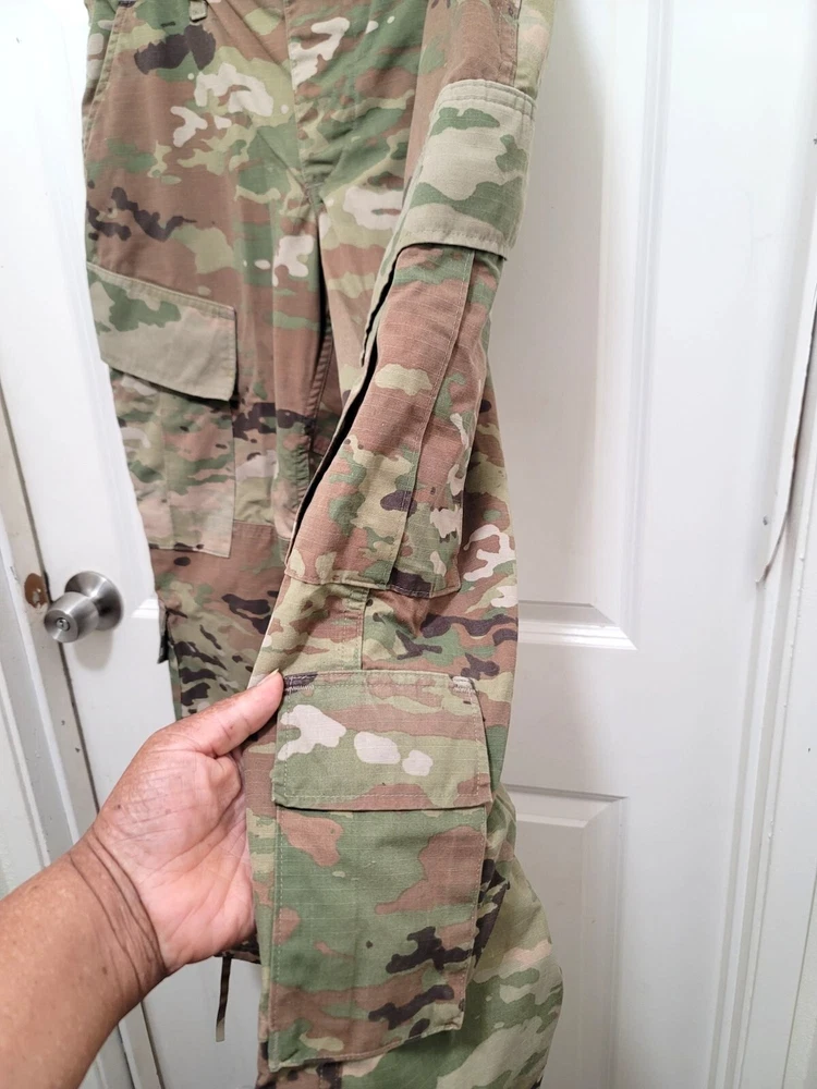 These tactical cargo pants offer durability and functionality for demanding environments. Designed with multiple pockets, they provide ample storage. Reinforced for strength, they are ideal for outdoor activities. • Camouflage pattern • Cargo pockets • Reinforced knees • Button fly • Adjustable waist • Drawstring ankles • Breathable fabric Waist = 34 inches Inseam = 30 inches CONDITIONS use, no visible flaws, good condition see photo for more details.