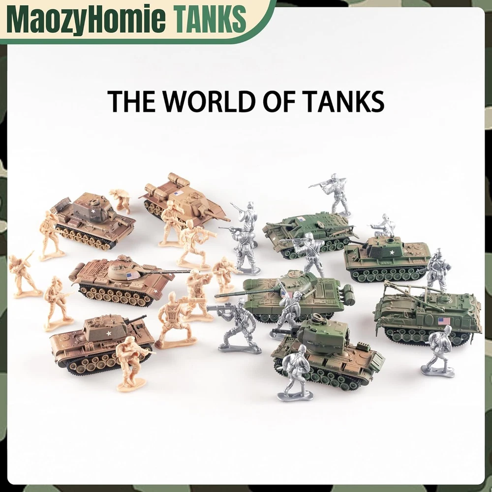 U.S Army Tank and Army Men Toys Playset, 2pc US Tank-1 Models with 10pc Toy Soldiers, Desert Tan 1:72 Military Vehicle, Ideal Military Toy Set for Kids Boys Product Details Product Dimensions: 7.84 x 6.25 x 1.51 inches Item Weight: 1.44 ounces Country of Origin: China Manufacturer recommended age: 3 years and up Department: boys Manufacturer: MaozyHomie Army Tanks Ready for Battle: Experience the excitement of commanding your own mini tank in thrilling battles! This set includes 2pc 1:72 US army battle tank-1 and 10pc tiny toy soldiers in dynamic battle stances. Each army toy tank measures 4" in length x 2" in width, making them easy for little hands to maneuver. Safe & Premium Army Tank: Made from child-friendly ABS material, MaozyHomie model tanks are thoughtfully designed with smooth edges and no sharp burrs to prioritise your children's safety. Constructed from durable ABS plastic, these tanks boast a sturdy texture, while the meticulous craftsmanship faithfully replicates every intricate detail of the tank prototype in the model. Realistic Tank Design Highlights: Featuring a manually adjustable barrel capable of tilting up to 30 degrees, our tank provides an immersive and dynamic gaming experience, empowering you to dominate the battlefield with accuracy. The turret hatch of the tank can be opened to unveil a meticulously crafted interior. And the tank includes 10 army soldier figures that can be strategically positioned to enhance the authenticity of your military scenarios. Enjoyable Assembly: MaozyHomie 1:72 scale Army Tank model is easy to assemble without glue and comes with assembly instructions. This enjoyable activity can be shared with friends and family while putting the tank together. You can also personalise and decorate the tank with stickers included according to your own ideas. We hope you enjoy the fun of assembling toy tanks! Perfect Gift Choice: The MaozyHomie military model is a versatile option perfect for display, collecting, customizing, or for use in tabletop gaming. Explore MaozyHomie collection of 7 distinct styles of American tanks - from sleek and modern to rugged and classic. Stop by MaozyHomie today and find the perfect one that matches your style.