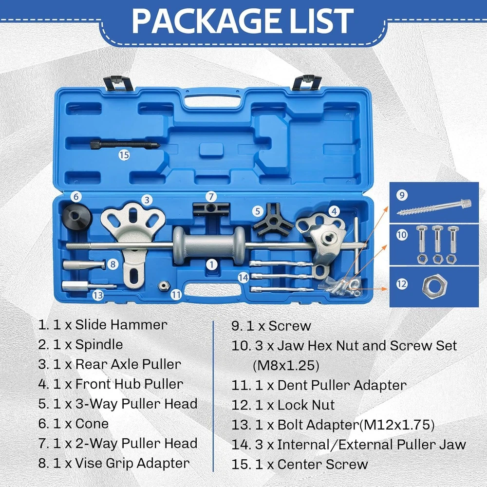 U.S.A???? Fast delivery?? Fast Shipping???? Easy for Operation: Install or change the dent hub gear puller remover set you need easily. Hand operated and screw-in design make it easy to install and use a simple yet effective set. Comes with a portable plastic case for easy carrying. Keeps all the repair tools tidy and resist. Durable Construction: Heavy duty & durable deals with stubborn hubs. The well-constructed 5lb hammer can do light to heavy duty jobs. This top-grade slide hammer puller set is expertly made in compliance with stringent industry standards to offer a fusion of a well-balanced design and high level of craftsmanship. SuperMotor DASBET 9-Way Slide Hammer Puller Set | 19PCS Front Wheel Hub Bearing Remover & Rear Wheel Axle Hub Dent Shaft Puller Tool Kit Dent Hub Gear Puller Remover Set U.S.A???? Fast delivery?? Fast Shipping???? Easy for Operation: Install or change the dent hub gear puller remover set you need easily. Hand operated and screw-in design make it easy to install and use a simple yet effective set. Comes with a portable plastic case for easy carrying. Keeps all the repair tools tidy and resist. Durable Construction: Heavy duty & durable deals with stubborn hubs. The well-constructed 5lb hammer can do light to heavy duty jobs. This top-grade slide hammer puller set is expertly made in compliance with stringent industry standards to offer a fusion of a well-balanced design and high level of craftsmanship. Jaws Details: The front wheel hub bearing remover including 2-jaw and 3-jaw pullers for internal and external work to provide a variety of combinations to pull bearing gears and seals. 2 and 3-way cross blocks and cone-type puller provide the perfect jaw configuration for most jobs. 19PCS Tool Set: Puller set with different attachments and configurations. Different types of pullers make the 9 way slide hammer multi functional. 9 applications of this Slide Hammer Puller Set: Front hub puller rear axle puller external 3-jaw pull internal 3-jaw puller internal 2-jaw puller external 2-jaw puller puller hook dent puller grip wrench. Wide Applications: The rear wheel axle hub dent shaft puller tool set is suitable for various pulling jobs. For pulling wheel bearing hub rear axle gear seal and more. Designed for the job doing no damage to your components. Right tool for the pulling job no more beating and harming your car parts. This product is professionally and meticulously designed to provide superior durability you are looking for. 2 and 3-way cross blocks and cone-type puller provide the perfect jaw configuration for most jobs. Heavy duty & durable deals with stubborn hubs. The well-constructed 5lb hammer can do light to heavy duty jobs. This slide hammer puller is professionally and meticulously designed to provide superior durability you are looking for. Install or change the puller you need easily. Hand operated and screw-in design make it easy to install and use a simple yet effective set. 1PCSlide Hammer1PCSpindle1PCRear Axle Puller1PCFront Hub Puller1PC3-way Puller Head1PCCone1PC2-way Puller Head1PCVise Grip Adapter1PCScrew3PCSJaw Hex Nut & Screw Set(M8 x 1.25)1PCDent Puller Adapter1PCLock Nut1PCBolt Adapter(M12 x 1.75)1PCCenter Screw3PCSInternal/External Puller Jaw 9 applications of this slide hammer puller set: front hub puller rear axle puller external 3-jaw pull internal 3-jaw puller internal 2-jaw puller external 2-jaw puller puller hook dent puller grip wrench. The versatile slide hammer puller set is suitable for various pulling jobs. For pulling wheel bearing hub rear axle gear seal and more. Designed for the job doing no damage to your components. Right tool for the pulling job no more beating and harming your car parts. Slide Hammer Puller Set Slide Hammer Puller Set Slide Hammer Puller Set Brand DASBET Brand DASBET Brand DASBET Pieces 19PCS Pieces 19PCS Pieces 17PCS Feature Chrome plated bright finish Feature Internal/external 2 or 3-Jaw Feature Internal/external 2 or 3-Jaw 4.1 out of 5 stars DASBET 9-Way Slide Hammer Puller Set | 19PCS Front Wheel Hub Bearing Remover & Rear Wheel Axle Hub Dent Shaft Puller Tool Kit Dent Hub Gear Puller Remover Set Share: Found a lower price? Let us know. Although we can't match every price reported we'll use your feedback to ensure that our prices remain competitive. Fields with an asterisk * are required ** 01 02 03 04 05 06 07 08 09 10 11 12 01 02 03 04 05 06 07 08 09 10 11 12 13 14 15 16 17 18 19 20 21 22 23 24 25 26 27 28 29 30 31 *Enter the store name where you found this product* Please select province Please select province * 01 02 03 04 05 06 07 08 09 10 11 12 01 02 03 04 05 06 07 08 09 10 11 12 13 14 15 16 17 18 19 20 21 22 23 24 25 26 27 28 29 30 31 Submit Feedback Product Details Jaws Details High Quality Professional Design Easy for Operation Package List 9-Way Slide Hammer Puller Set Wide Application DASBET Puller Tools for you Technical Details Additional Information Warranty & Support Feedback Item Specifics Size 24 x 9 x 4 inches Weight 16.78 pounds Type Floor Mats Brand Unbranded Payment If you do not have a PayPal account, to get started and buy your first item with us is very easy. Simply click on the 'Buy It Now' button and follow the eBay checkout steps. Select PayPal as the payment method you then will be given the chance to enter your card details in to PayPal's secure checkout in order to pay for your order. Shipping 2. We provide three kinds of shipping for choice. Shipping way depend on delivery address. Returns If an unit is received defective, of course we take it back or replace it. If the unit is received as expected, we must charge for our expenses if you want to send it back. We have to charge for the work of handling, retesting and restocking. Contact Us Dear buyer, Thank you for visiting my store! Our warehouses are located in many regions around the United States. According to the customer's delivery address. Use USPS/UPS/DHL logistics transportation service. Prioritize the be