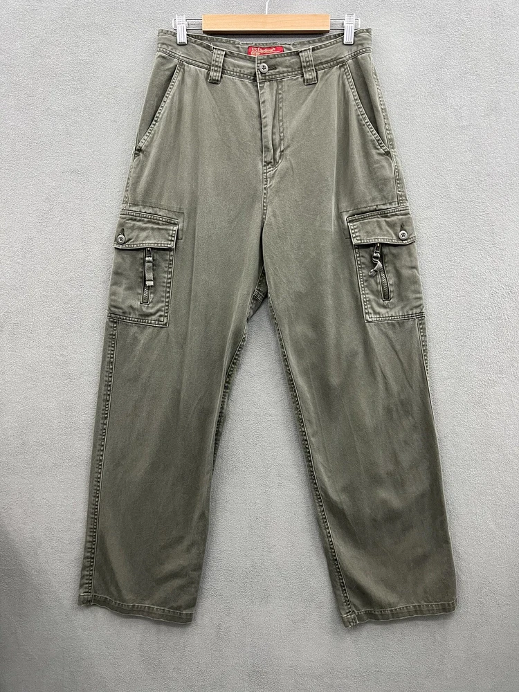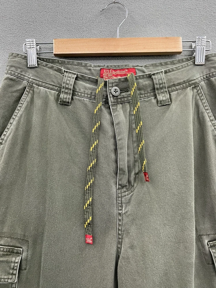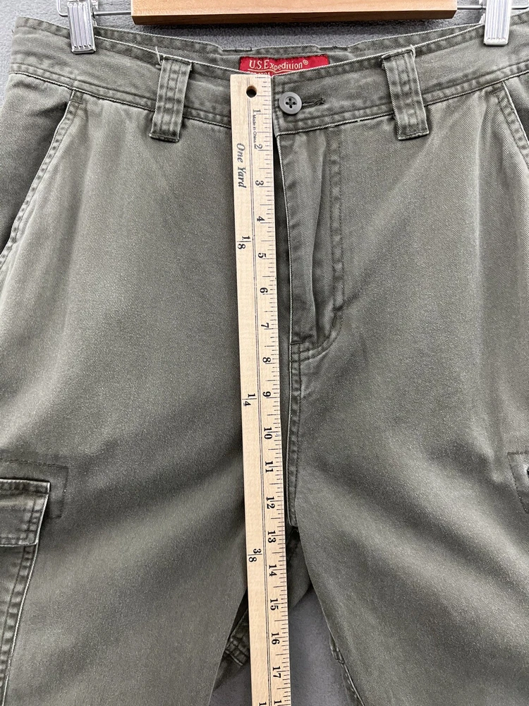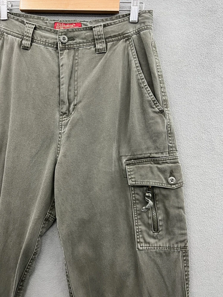 Get ready for your next adventure with these US Expedition Men's Cargo Pants in a stylish green hue. These pants feature a solid pattern and a relaxed fit, making them perfect for travel, workwear or casual occasions. The pants come with a variety of closures including zip, button and drawstring, and a flat front design. The canvas fabric and high rise provide both durability and comfort while the cargo pockets offer ample storage for your essentials. These pants are available in size 32 with a 31-inch inseam and can be worn in any season. Add these cargo pants to your wardrobe today!