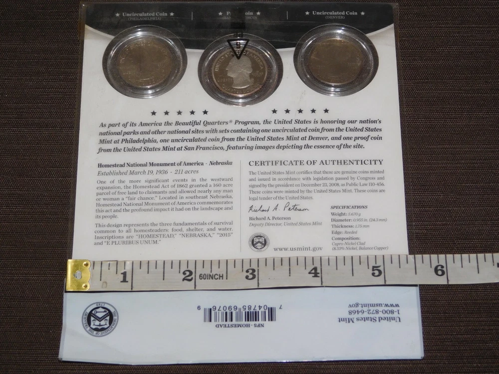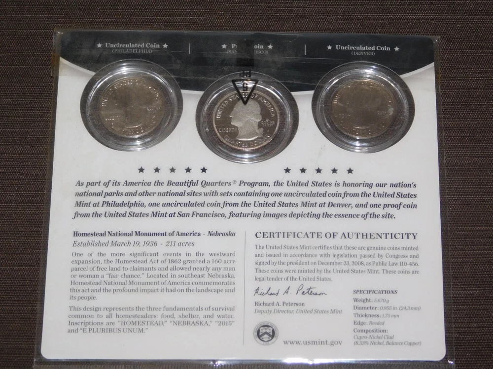 YOU ARE BIDDING ON............... .. US MINT 3 COIN SET 2015 AMERICA THE BEAUTIFUL QUARTERS HOMESTEAD NEBRASKA ....... SOME PACKAGE WEAR/LIGHT STAINS.......PLEASE VIEW PHOTOS FOR CONDITION.***PLEASE E-MAIL IF YOU HAVE A QUESTION OR WANT AN ADDITIONAL PICTURE....PLEASE VISIT MY EBAY STORE FOR ADDITIONAL VINTAGE ITEMS..THANK YOU***IV-BX3939-XXXX....