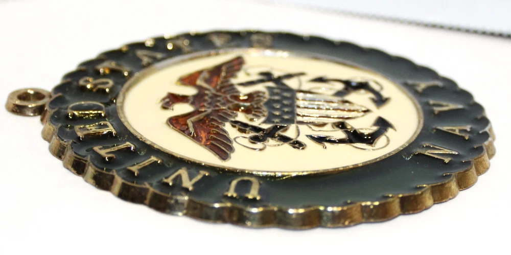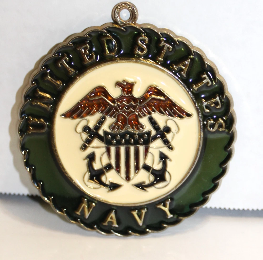 US Navy Stain Glass Vintage Retro Stamped Suncatcher Hanging Pendent Gold Trim Add a touch of vintage charm to your home decor with this beautifully designed US Navy stained glass suncatcher. The intricate design features a Bald Eagle, Anchor & Flag, all crafted in a green color with gold trim. Measuring small in size, this suncatcher is perfect for adding a pop of color to any room in your home. The stained glass material gives it a unique and elegant finish that is sure to impress. Ideal for any US Navy collector or as a gift for a loved one. See Photos