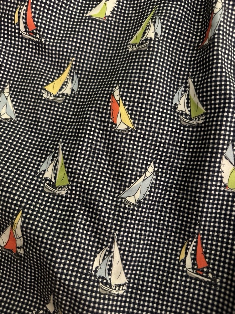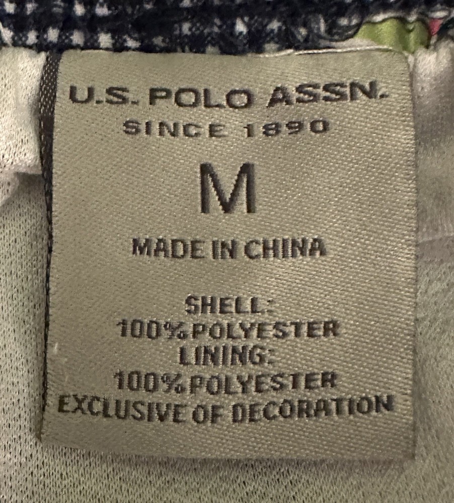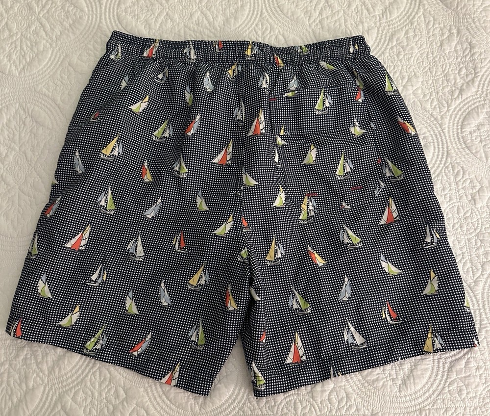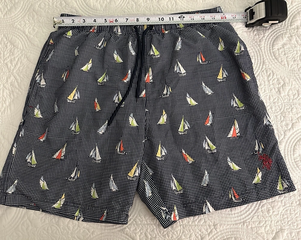 U.S. Polo Assn men’s swim trunks in a classic navy micro-check with colorful sailboat print. Clean nautical look with a modern mid-length 6.5” inseam. Elastic waistband with adjustable drawstring for comfort. Lightweight quick-dry polyester shell with full lining. Measurements taken flat: Waist 16” across (approx. 32” around, stretches larger) Inseam 6.5” Outseam 17” Excellent pre-owned condition. No stains, fading, or discoloration. Perfect for beach, pool, vacation, or summer wear. Ships fast and carefully packaged.