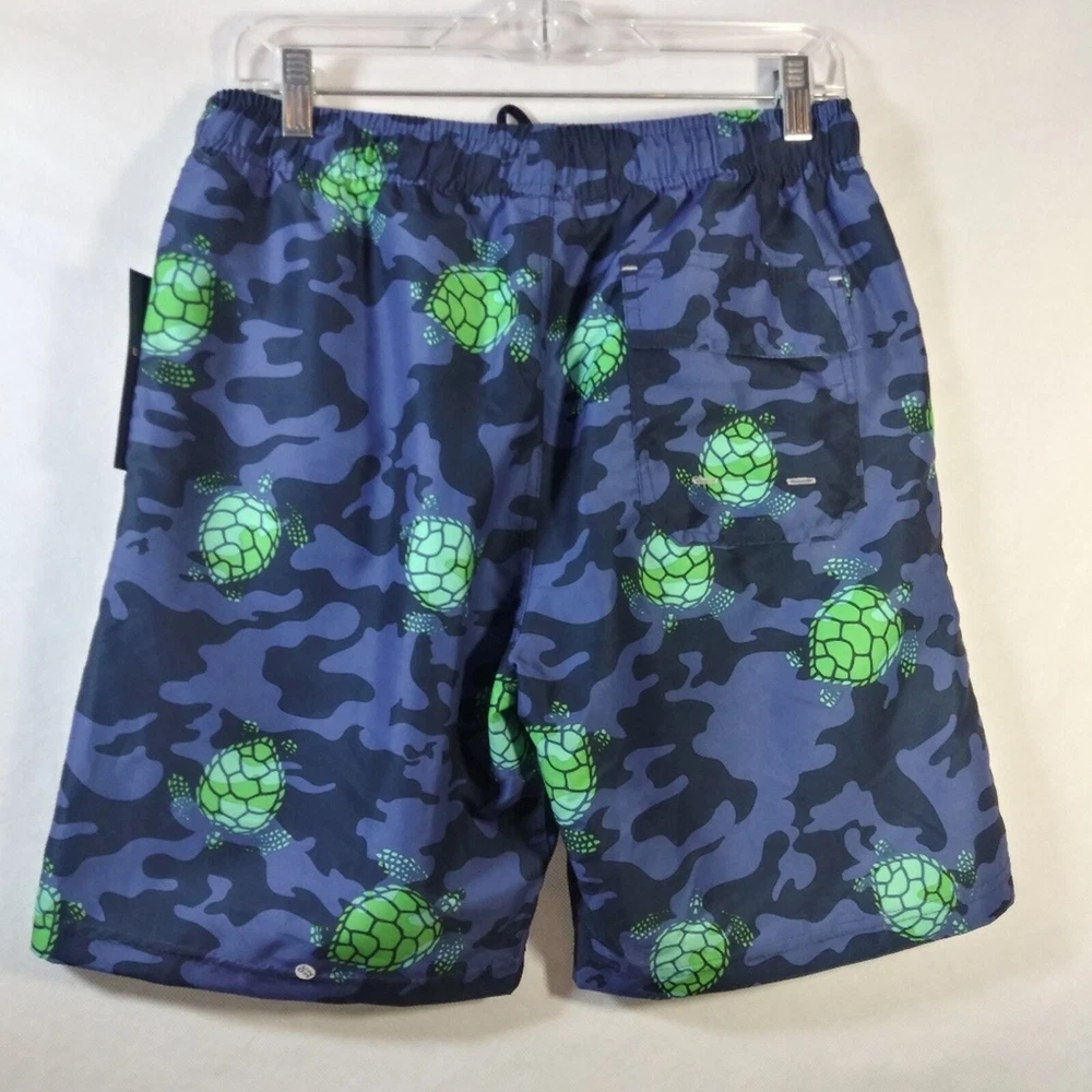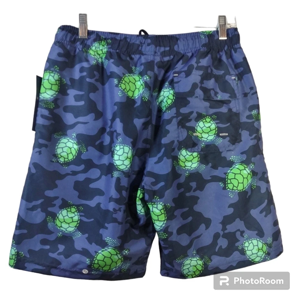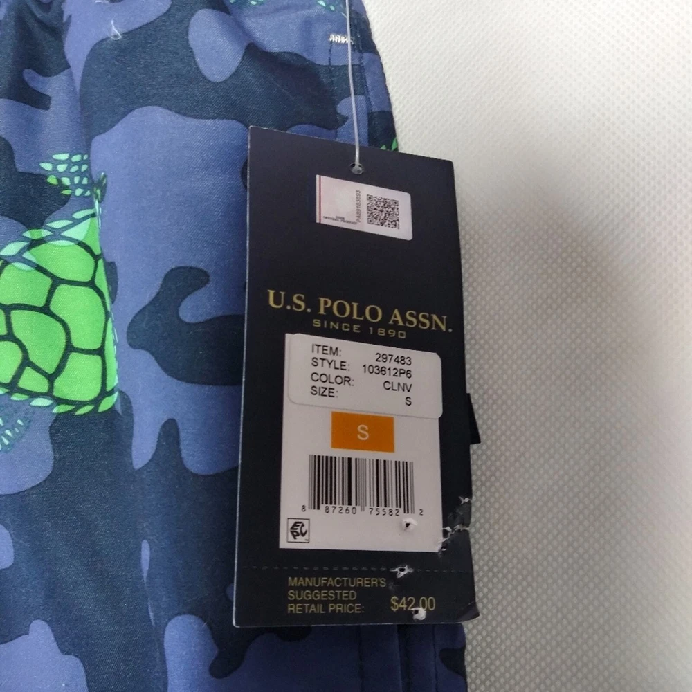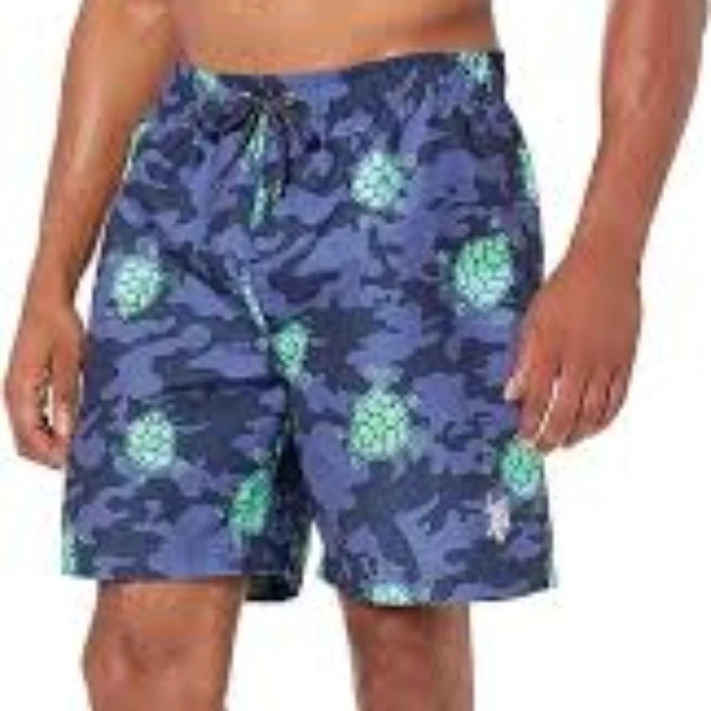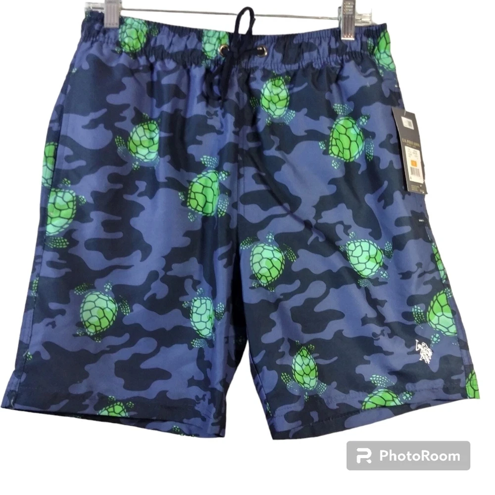 U.S. Polo Assn. Turtle Camo Swim Shorts Classic Navy Size Small Drawstring closure Machine Wash Enjoy beach days in style wearing the U.S. POLO ASSN. Turtle Camo Swim Shorts. Regular fit. Elasticized waist with drawstring. Side hand pockets. Allover camo and turtle print. New with tags approximate measurements waist across 15" rise 12" inseam 8"