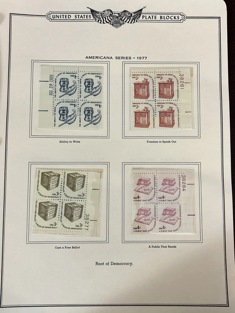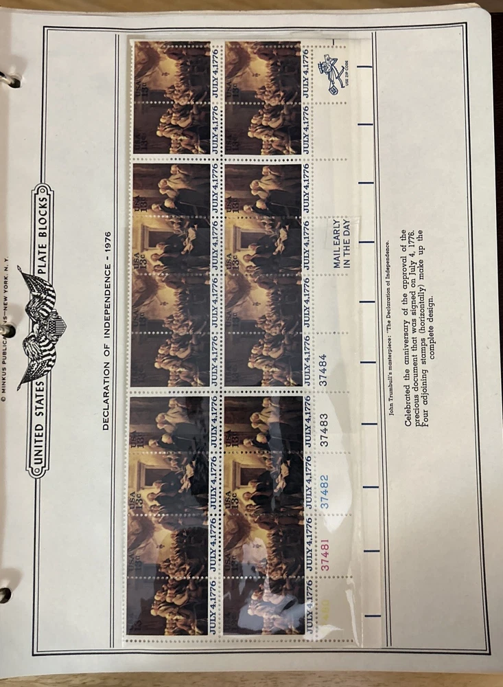 This incredible collection of US STAMPS Minkus Plate Block Album Pgs 1971-1978 is a must-have for any stamp collector. The album features a wonderful assortment of stamps that showcase various topics such as Space, Nature, Politicians, American Civil War, Seasonal, Christmas, Flags, National Emblems, and Medical and more . To the best of my knowledge The stamps are in Mint Never Hinged/MNH quality, making them an excellent addition to any collection. The album is a perfect gift for anyone who loves collecting stamps or is interested in any of the topics mentioned above. With its unique collection of stamps, it is sure to impress any stamp collector. Don't miss out on the opportunity to own this amazing collection. There is one page out of 112 that does not have stamps on it. See last photo in picture section!!!