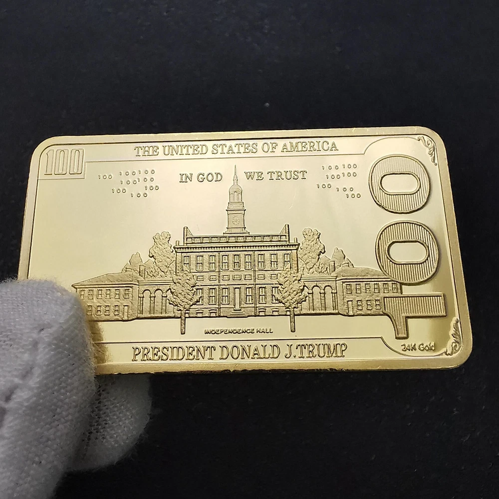 USA 2024 President Donald Trump $100 Gold Colored Commemorative Bar Collectible Features: Material:gold color. Size: 5 x8 x 3 cm. Weight: approx. 40g. Crafted with exquisite workmanship, it is a perfect accessory for your collection It is a great gift for your friends or family members. package: 2 pieces packed with premium capsule and opp bag Product Description: $100 Gold Colored Commemorative Bar Collectible Souvenir Material: Color: as the picture shows, (Due to the difference between different monitors, the picture may have slight color difference. please make sure you do not mind before ordering, Thank you!) Package weight: 80g Package size: 4x2x2cm,(Please allow 1-3mm error due to manual measurement. please make sure you do not mind before ordering.)