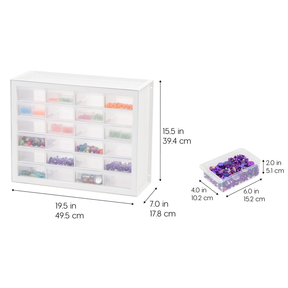 USA Drawer Parts Cabinet / Craft Cabinet /Tool Organizer USA Drawer Parts Cabinet / Craft Cabinet is a practical storage solution for home, garage, workshop, or office. You can small parts or accessories, and categorize them with each drawer to organize your space. With this parts drawer, you could easily find things you need. Organize, sort and : This plastic cabinet/ tool organizer will organize and protect your small parts, office supplies, crafts, beads, hardware, fishing, and more. Secure Placement: Securely stack multiple units with interlocking feet, or four mounting holes allow the cabinet to easily hang on a wall. Multiple drawers: These multiples drawers allow you to sort and your items by each category to easily identify a specific item you are looking for! You can even label each drawer to make it more obvious. These conveniently sized drawers are great for holding an array of small pieces, and the built-in lip at the back means they won’t fall out of the drawer cabinet when opened. Drawers are made to fit a longer item like pens and markers, so it is also suitable for organizing your stationaries. The perfect organizer on teacher desk, or craft workspace, garage workspace, a vanity desk for makeup and accessories and so much more! Drawer Dimensions: Small inner drawer for multi-drawer stackable cabinet measures 6. 00” x 1. 75” x 1. 50”. Large inner drawer measures 6. 00” x 4. 00” x 2. 00”. Made in the USA: High-quality materials are used for our domestically-manufactured products. MULTI-PURPOSE ORGANIZER: Perfect tool box & classroom organizer storage solution to organize screws, hardware, small parts, nuts and bolts, stationaries, office and classroom supplies, crafts, beads or sewing supplies, fishing gear, and more STACK OR WALL MOUNT: The cabinet’s grooves on the lid securely lock in on top of another when stacked. It can be wall-mounted and used to organize screw, hardware, tool, and small parts MULTI-DRAWERS: Sort, and organize screws, hardware, small parts, nails, and tools with these multi-drawers tool organizer to grab things easily and quickly MADE IN USA: High-quality, recyclable materials are used for our domestically-manufactured products. The sturdy plastic makes these durable, and the smooth glide drawers give you easy access to contents DIMENSION: 19.5”L X 7”W 15.5”H (Drawer: 6”L x 4”W x 2”H)