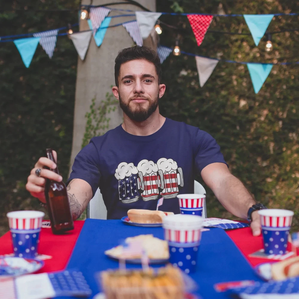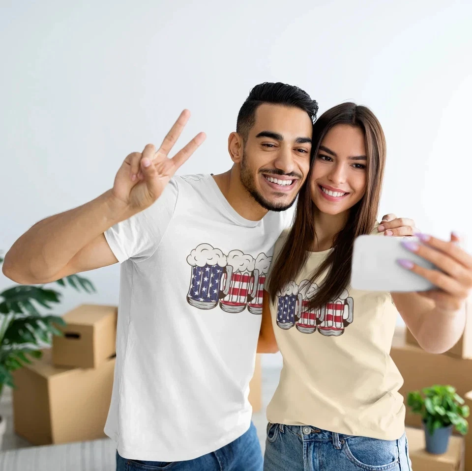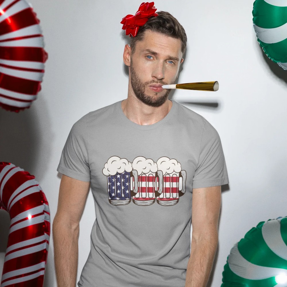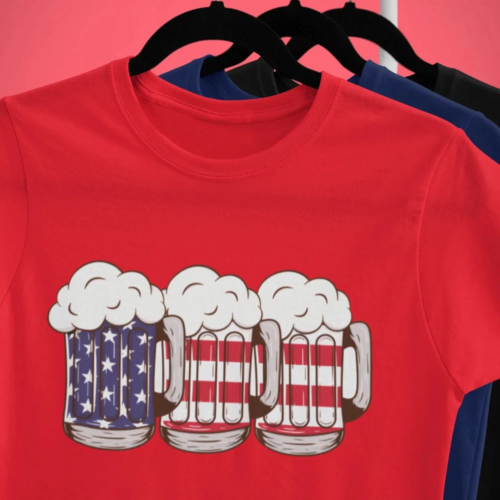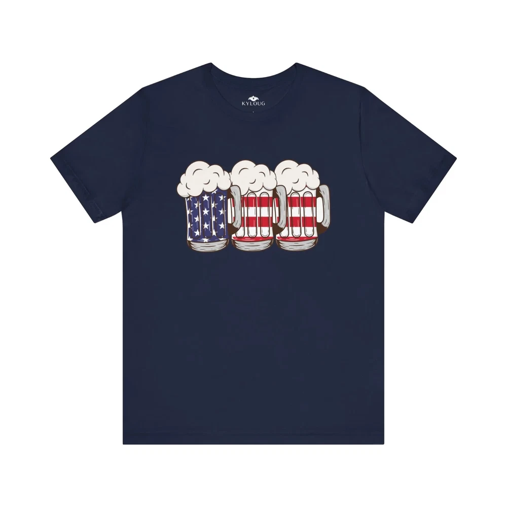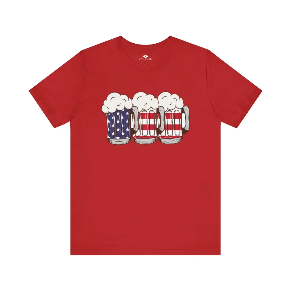 This USA Beer Glass Printed t-shirt is perfect for both men and women. Show off your love for American beer with this round neck shirt. Made with high-quality materials, it provides both comfort and style. Wear it to your next BBQ or game night and impress your friends. Overview: This classic unisex jersey short sleeve tee fits like a well-loved favorite. Soft cotton and quality print make users fall in love with it over and over again. These t-shirts have-ribbed knit collars to bolster shaping. The shoulders are tapered for a better fit over time. Dual side seams hold the garment's shape for longer. Fabric: Made with 100% Airlume combed and ring-spun cotton, a lightweight fabric (4.2 oz/yd² (142 g/m²)) that is easy to layer, breathable. Perfect for active and leisure wear. Fit: The retail fit that is perfect for casual and semi-formal settings. The crew neckline adds a classic, neat style that's perfect for accessorizing. Origin ; manufactured in the US and internationally in humane, no-sweatshop, sustainable way. Fabric blends: Ash and Heather Prism colors - 99% Airlume combed and ring-spun cotton, 1% polyester; Heather and Solid Blend colors - 52% cotton, 48% polyester; Athletic Heather and Black Heather - 90% cotton, 10% polyester.