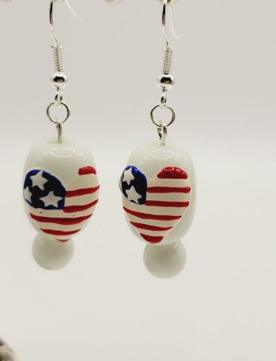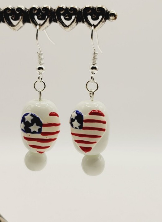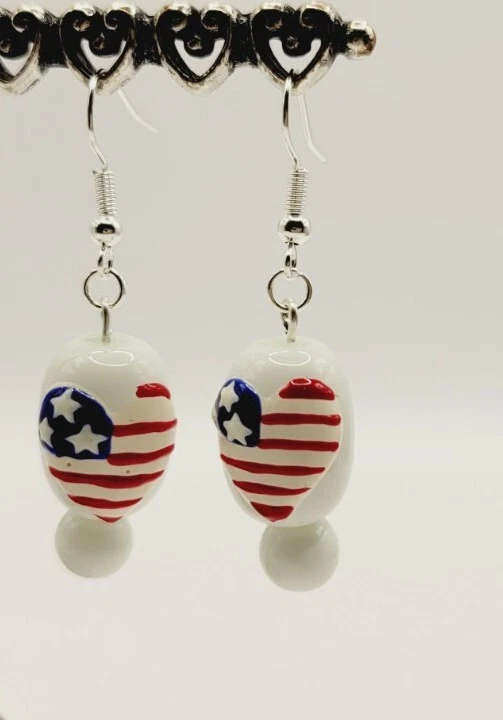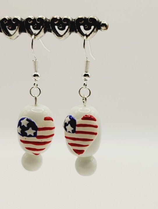 HomeUSA Flag Love Hand-Painted Red White Blue Heart Dangle Beaded Earrings Set