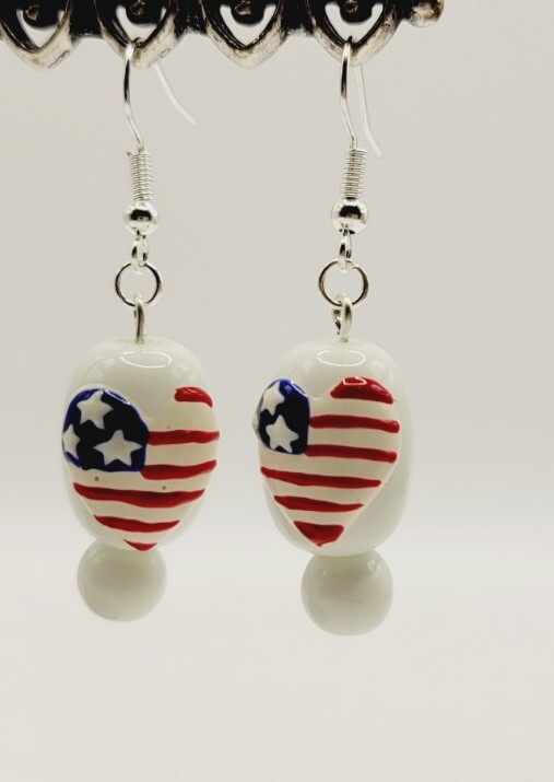 USA Flag Love Hand-Painted Red White Blue Heart Dangle Beaded Earrings Set