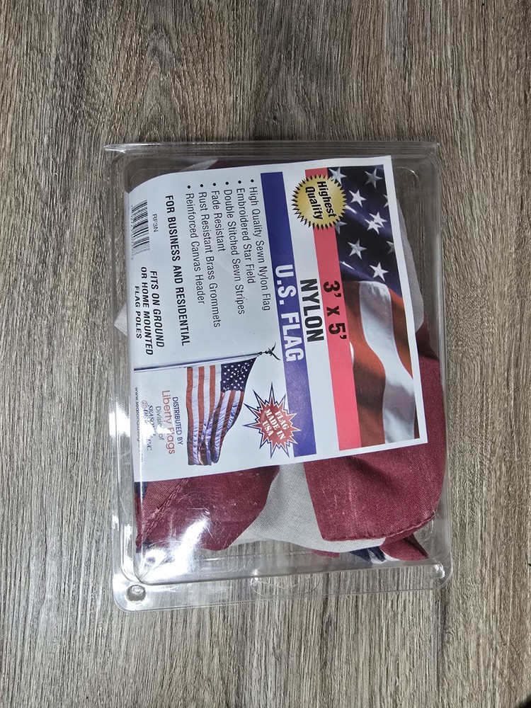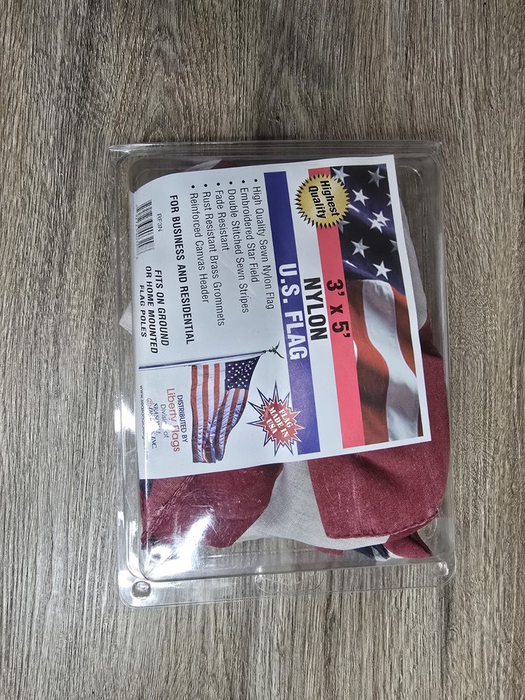 Show your patriotism with this American flag from Seasonal Designs. Made from durable nylon, this 3 ft. x 5 ft. flag features vibrant red, white, and blue colors and brass grommets for easy mounting. Its patriotic theme makes it the perfect decoration for any patriotic event or occasion. This United States flag is designed with a national flag subject and is made in the United States. Its unit type is in feet, and it is the perfect size for outdoor use. Get this flag today to show your love for the United States.