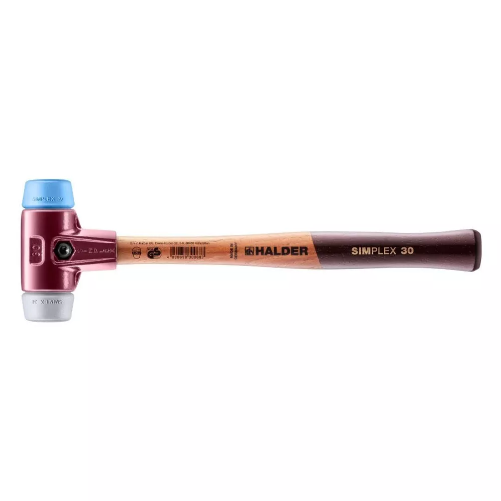 "The Simplex Mallet is the signature hammer in the line. This patented hammer has a "split housing' design that is made from heavy duty cast iron. This split housing allows it to be take apart and the components can be replaced when worn or damaged. It solidly locks in the variety of replaceable insert faces. The faces are made of several different durable materials; from soft rubber to medium hard plastic to hard nylon. also offers aluminum and copper faces for hitting very hard surfaces such as hardened steel (copper faces are only with Simplex with reinforced cast iron housing; for details). SIMPLEX soft-face mallet with the insert combination of TPE-soft (blue, soft, no marring) / TPE-mid (grey, medium hard, no marring). Cast iron housing with integrated handle protection sleeve and excellent break resistance. High-quality, vibration-damping, and ergonomically shaped wooden handle; grip area with double coat of varnish (resistant to dirt). All parts can be replaced / retrofitted, resulting in great savings in cost and resources. Available in sizes of D30mm to D60mm.