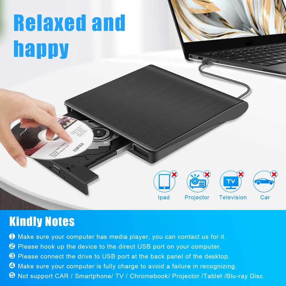DVD-ROM, DVD-R, DVD+R, DVD-R, DL, CDA, CD-ROM, CD-R, VCD, SVCD, CD-RW USB 3.0 External CD/DVD Drive Burner Reader Writer Player for Laptop,PC Desktops USB 3.0 DVD/CD ROM Writer Drive UPGRADED EXTERNAL DVD DRIVE CD BURNER DVD PLAYER FLOPPY DISK READER Features: USB power supply does not require an external power supply (plug and play without driver, except for win98 system, win98 system needs to install drivers) Laptops, desktops, Apple computers, and all-in-one computers that support USB3.0 and USB2.0 interfaces. (tablet PCs and ultra-thin notebooks are not supported) Can play CD, DVD, VCD and other formats disc. Support a variety of disc formats: DVD-ROM, DVD-R, DVD+R, DVD-R, DL, CDA, CD-ROM, CD-R, VCD, SVCD, CD-RW Fully support DOS boot and System recovery problem Support burning CD, DVD vcd Wide Compatible: Supported OS : WIN98/XP/ WIN7/ WIN8/, WIN10/ XP/ VISTA / Mac os 8.6 or above system (except win98 system, win98 system needs to install the driver) Please note that this item doesn’t support Surface series laptop. Specification: Plug & play . Easy to use,powered by USB port. No external driver and Power needed. Just plug it into your USB port and the DVD driver will be detected High speed . Compatible with USB3. 0 and backwards compatible with USB2. 0 , bringing faster data transmission speed (up to a maximum of 5Gbps) and stable performance with strong fault tolerance Intelligent tech . Designed with eject button so that you never have to worry about your disc getting stuck inside this external CD/DVD drive. The copper mesh technology of this external component, you can be rest assured of stable data transmission Trendy design . Brushed texture shell brings trendy sight and touch enjoyment. Embedded cable design, worry- off cable missing any when and where Wide compatibility . Ideal for various devices. It supports Windows XP/2003/Vista/7/8. 1/10, Linux, all version Mac OS system. For the desktops, Please connect the device to the back USB port of the motherboard for normal use Package included: 1 x USB External DVD Drive Noted: 1.Please make sure the laptop is with sufficient capacity, a low capacity may cause the device can't be recognized. 2.For Apple laptop, it can not be used the button to eject the disc directly. After you have finished importing the file, please right click on the drive icon “Eject "Audio CD"”, then the disc will pop up automatically. 3.The new released Windows system have discontinued the internal DVD media player software, customer using Windows 10 and above are advised to Install VLC Media player to Play DVD and CD. Win11 system must be used with a network connection! 4.Please hook up the device to the direct USB port on your computer. If you connect it to a USB hub or extension cards, it maybe cannot recognize the device or cannot read the CD/DVD. 5.If the button to open the disc does not work, please use the forced ejection hole. Payment Delivery details Terms of sales About us Warranty Policy Payment 1. We accept payment via PayPal, Visa, Mastercard, Apple Pay, Google Pay etc. 2. All payments must be prepaid. Delivery details DeliverDel Shipping time Item located in California and New Jersey of Unites States of America, there are 2 warehouses. Usually, delivery time less than 7 days in California. Except holiday, weekend, weather delay etc. Other states in U.S.A, the whole shipping time may be in 7 to 15 working days. Package sent from which above warehouse according to inventory stock quantity , and post address distance. Send us eBay message if you have shipping time request before you pay, such as send item through other shipping methods. The whole shipping time is an estimated time, it may be different with actual situation. Hope you understand and be patient. 1 to 3 days shipment Currently, delivery successful in California Only. Other states in U.S.A, it may be later delivery in 3 days. Hope you consider carefully before select this shipment. No freight refund, but provide coupon as remedy. ivery detailsy details Terms of sales Order cancellation At purchase history , find paid order and send cancel request. Usually, request would be agree in 24 hours. Item sent , request failed. Let seller know your request through eBay message, try decline package , or ask seller send return label, or provide other better solution. Revised address We only accept shipping address at PayPal's account, per your and ours account security demand. It is better revised your new address at PayPal account, before you made payment. Bother you send eBay message to us, if you forget revised. It may be our service officer is rest. If you have not received our reply in time, accept our apologies sincerely. Replacement We accept 30 days return and refund request, after you get item. You would get a brand new item, or refund full payment, if item is defective. It is better hassle return request through eBay message, and provide photo at message.. We set eBay automatically respond to return request, it may be cause eBay solution is not your and our expected. For example, you want replace item, eBay asked buyer return and refund. Exchange Send eBay message to us, it is better provide photo at message. you would get correct item finally, get return label after exchange, bother you help us return this wrong item. About us We are specializing in selling laptop batteries, ac adapter/charger etc. for about 10 years, and we are the best seller on these categories for years. All item passed FCC / CE / ROHS certificates. Help buyer reduce the risk of damage, fire, dangerours mostly. We work with good supplier who supply good quality materials and products and we have 2 factories producing most of our products, we are confidence to provide very good quality products with competitive price. Warranty Policy About Warranty - You don't need to pay for eBay Square Trade for getting covered by our warranty policy. - There is a warranty label on our products like batteries and adapter ch