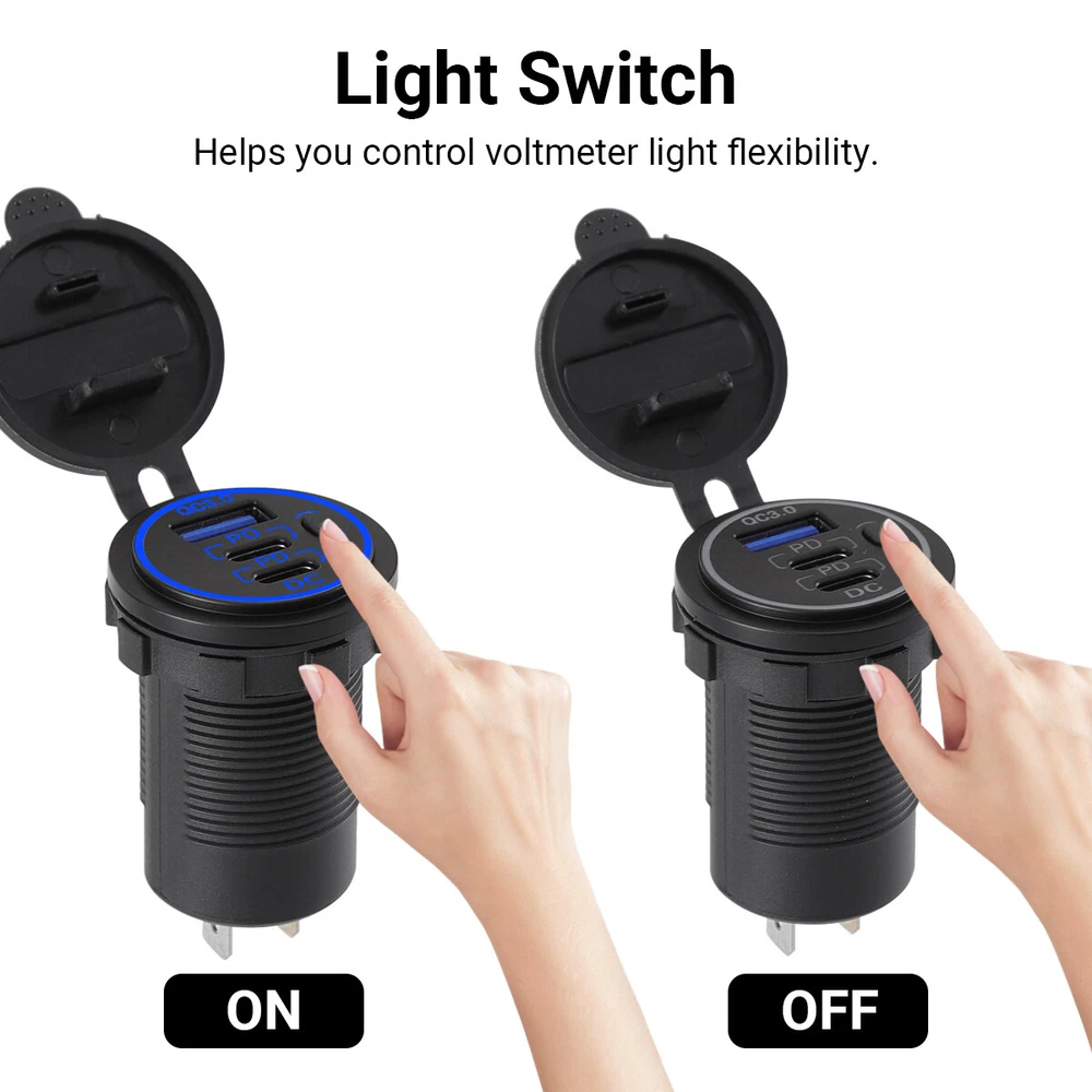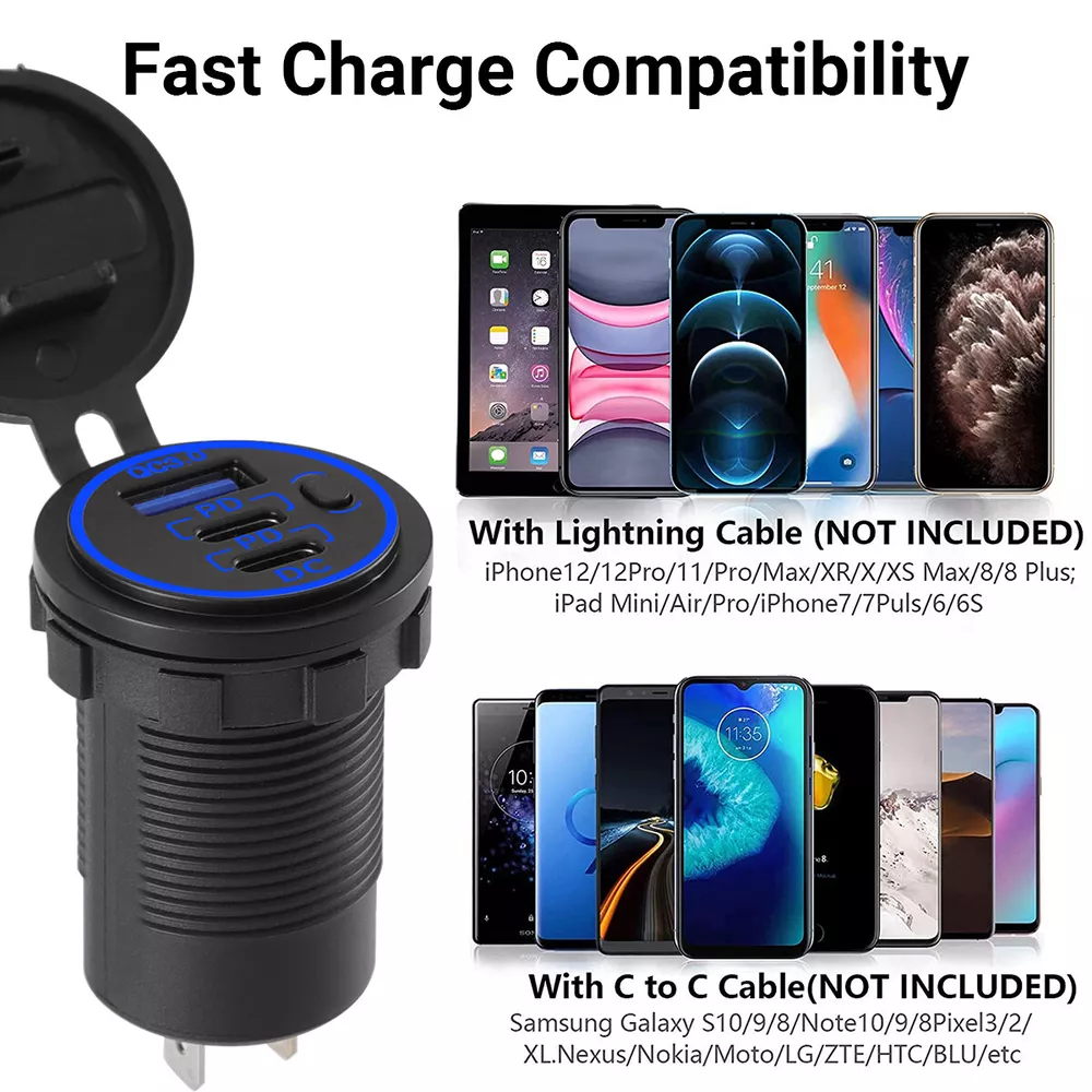 Compatible Brand: Universal Features: Dustproof, Fast Charge, LED Voltmeter, ON/OFF Switch Compatible Model: Universal Connectivity: USB-C Color: Black Type: Car Charger Warranty: Yes MPN: Does not apply Brand: Unbranded Maximum output power: QC3.0 (18W)+PD36W+PD36W Input Voltage: 12V-24V Voltmeter Color: Blue Suitable for: RVs, boats, cars, motorcycles, trucks etc. Number of port: 3
