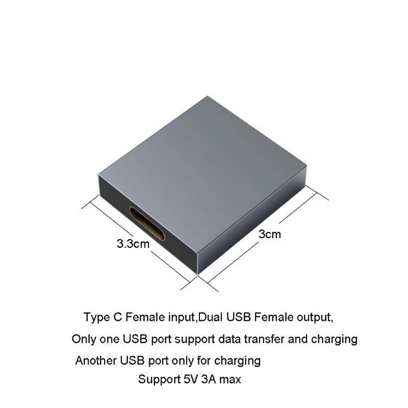 Features: brand new and high quality. Not only for charging,but also can transfer data,one USB 3.0 Port for data and charging ,another USB 3.0 Port only with charging function. Type C female port for Type C to Type C or USB to Type C male Data Cable,USB 3.0 female for USB cable or USB keyboard mouse and more.Need to use your own USB C Male cable connect to this Adapter,then become a USB Female Powered convertor. Type C female port input function,Dual USB 3.0 Female port with output function,if use USB to Type C male cable connect to this adapter,will become USB male to female extension cable. USB C female to dual USB 3.0 female adapters. Simple Plug and for Play, No Drivers Needed. Specifications: for Shell Material: Metal Type: Accessories Color: Gray Size: 3x3.3cm Quantity: 1 Pc Package Includes: 1x USB C Female to Dual USB 3.0 Female convertor note: Please allow 0-1cm error due to manual measurement. pls make sure you do not mind before you order. Due to the difference between different monitors, the picture may not reflect the actual color of the item. Thank you!