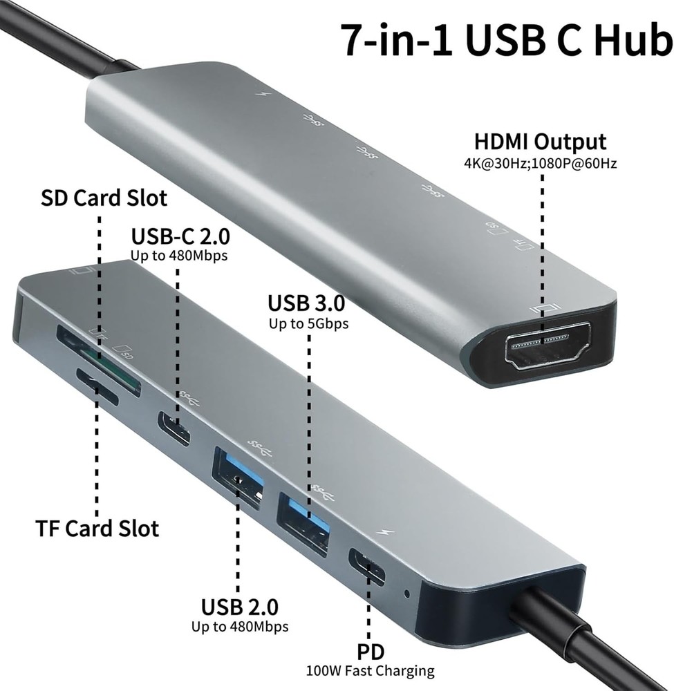 USB C Hub Multiport Adapter, 7 in 1 USBC Dongle with 7 IN 1 C Hub, Grey Description: Features: 7-in-1 USB C Hub: USB C multiport adapter equipped with 1*4K HDMI port, 1*USB-C 100W PD charging, 2*USB-A ports, 1*USB-C port and TF/SD card reader slot, providing excellent connectivity to meet all of your expansion needs at the same time, and greatly improving work efficiency. 4K Visual Feast: Easily connect 4K@30Hz HD video to any monitor, TV or projector by mirroring or expanding the screen with the USB Type C to HDMI adapter. Perfect for photographers and video editors! Note: USB-C devices need to have DP Alt mode(Video Transfer Function). 100W PD Fast Charging: The laptop docking station provide up to 100W of high-speed charging, no need to worry about power running out while using the other functions. Ideal for MacBook Pro/Air and other USB-C devices.(PD port doesn't support data transfer, please use another usb-c port) Fast Data Transfer: USB C Hub is equipped with multiple fast and stable data transfer ports. USB 3.0 supports up to 5Gbps for high-speed file transfer. USB-C 2.0 and USB 2.0 supports 480Mb/s for meeting your peripherals with various interface. SD/TF card slot allows quick access to files for viewing your photos or videos, can read up to 1TB cards. Universal Compatibility: The usb c dock is crafted with a high-quality aluminum housing for enhanced durability and heat dissipation. Plug and play, no need to install any drivers. Compatible with MacBook Pro, MacBook Air, M1, M2, iMac, iPad Pro, iPhone 15/16 Series, Dell XPS, Surface, HP and other USB-C port devices. SHIPPING: We are always working hard to ensure your package arrives as soon as possible. Please understand that some factors like weather, high postal traffic, and the performance of shipping companies are outside of our control. We offer free shipping to the lower 48 states and ship within 3 business days of payment, usually sooner. We do not accept P.O. Boxes. Please provide a physical address. For shipping outside of the continental USA, we only use eBay's Global Shipping Program. The item is shipped to KY and then sent to the rest of the world. International customers are responsible for all duties and taxes. Continue to check out in order to calculate costs for shipping the item to your country. Messages regarding eBay's Global Shipping Program MUST be directed at eBay EXCLUSIVELY. PAYMENT: We accept payment by PayPal only (Can accept all kind of credit cards). Please pay as soon as possible after winning an auction, as that will allow us to post your item to you sooner. Payment must be received within 3 business days of auction closing. Before buying, please make sure your PayPal and eBay address is correct. If not, please correct it before payment. We have confidence in our products, but if you are not fully satisfied please contact us within 30 days of purchase and you will get full refund of your money. Return the product in the same condition you received it. Please note - return shipping will be paid by the buyer.