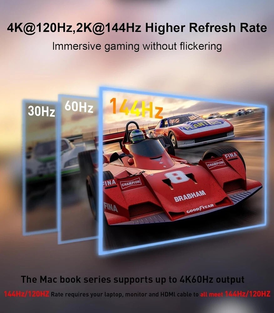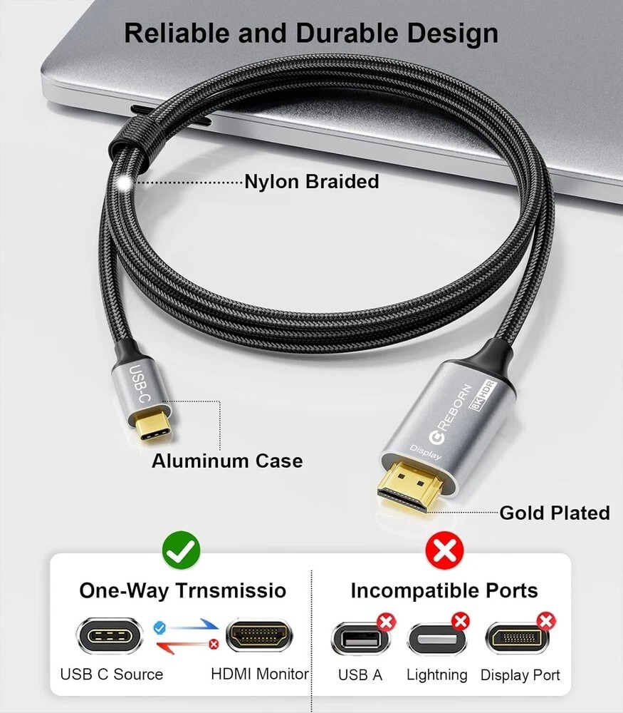 About this item 【Top Technology - Reborn USB C to HDMI 8K Cable】The Reborn USB C to HDMI 2.1 Cable adopts state-of-the-art technology. It supports 8K@60Hz/30Hz, 4K@120Hz/60Hz and 2K@240Hz/144Hz/120Hz, making every detail vivid and every signal precisely processed. With its unique Dynamic HDR and 12 Bit color processing technology of 8K HDMI, each video scene is enhanced. Every frame shows improved depth, brightness, detail and contrast, plus a wider color gamut 【Seamless Device Integration】Connect with ease! This USB C to HDMI 2.1 Cable is designed to effortlessly bridge the gap between your TYPE C-enabled device and any HDMI display. It's the perfect companion for laptops, tablets, and more, ensuring a smooth transition from USB C HDMI to a world of high-definition entertainment and productivity 【Plug and Play, Super Easy!】No hassle, instant amazing results! Our Reborn USBC to HDMI Cord is incredibly simple to use. Just insert it into the corresponding interface and watch your device come to life on the big screen. Whether you're a tech newbie or a seasoned pro, you'll love the effortless operation of this converter. *Note: Only Android phones with video output are supported 【Reliable and Durable Design】The Reborn USB Type C to HDMI Cable flaunts a premium nylon braided exterior and sleek aluminum shell, exuding high-end elegance. With a cutting-edge chip, it promises stable, high-speed connections, ideal for vital presentations, captivating movie nights, and thrilling gaming, built to endure and impress 【Compatibility Check】The Reborn 8K Thunderbolt 4 to HDMI Cable directly links laptops with USB-C/Type C/Thunderbolt 3 ports to HDMI monitors, TVs, or projectors. It's compatible with MacBook Pro (2016 - 2022), MacBook Air (2018 - 2022), iMac (2017/2020), Mac Mini (2016 - 2021), iPad Pro (2018 - 2022), iPad Air (2020 - 2022), Apple M1/M2 devices, Surface Book 3/Pro 7/Laptop 3, Chromebook, Dell XPS 13/15/17, Galaxy S9 - S22, iPhone 15/Pro/Plus/Max and more Product Description Reborn USB C to HDMI 2.1 cable (8K@60Hz, 4K@144Hz, 2K@240Hz). The TYPE C/M is the signal input port. The HDMI output resolution is 7680*4320@60HZ and is downward compatible with resolutions such as 3840*2160@60Hz、 120Hz、2560*1440@60Hz、120Hz、1920*1080@60Hz、120Hz, etc. (To achieve 8K resolution, both the graphics card and the display need to support 8K). Connector: Input: USB-C Output: HDMI2.1 Specification: Shape: Small, lightweight, and easy to carry. Installation method: Plug and play, no driver or software required. Gold-plated connector: Optimized performance and corrosion resistance. High-quality aluminum alloy: Excellent heat dissipation effect. Ultra-high speed: Supports up to 8K@60Hz resolution. Package contents: 1X Reborn USB C to HDMI 2.1 cable 6 FT Shipping We offer FREE shipping on all orders! We ship within Three business days of payment, usually sooner. We use a selection of shipping services such as UPS, FedEx, USPS etc. We only ship to the lower 48 states, no APO/FPO addresses or PO Boxes allowed. Local pickups and combined shipping options are not provided at this time. Return You can return a product for up to 30 days from the date you purchased it. Any product you return must be in the same condition you received it and in the original packaging. Please keep the receipt. Payment We accept payment by any of the following methods: PayPal Please pay as soon as possible after winning an auction, as that will allow us to post your item to you sooner! Feedback Customer satisfaction is very important to us. If you have any problem with your order, please contact us and we will do our best to make you satisfied. Contact Us If you have any queries, please contact us via ebay. We usually respond within 24 hours on weekdays. Please visit our eBay store to check out other items for sale! Thank you for shopping at our store. Disclaimer We are working with different suppliers in USA to deliver the item to your doorstep. If you have any issues regarding the item, Feel free to ask.