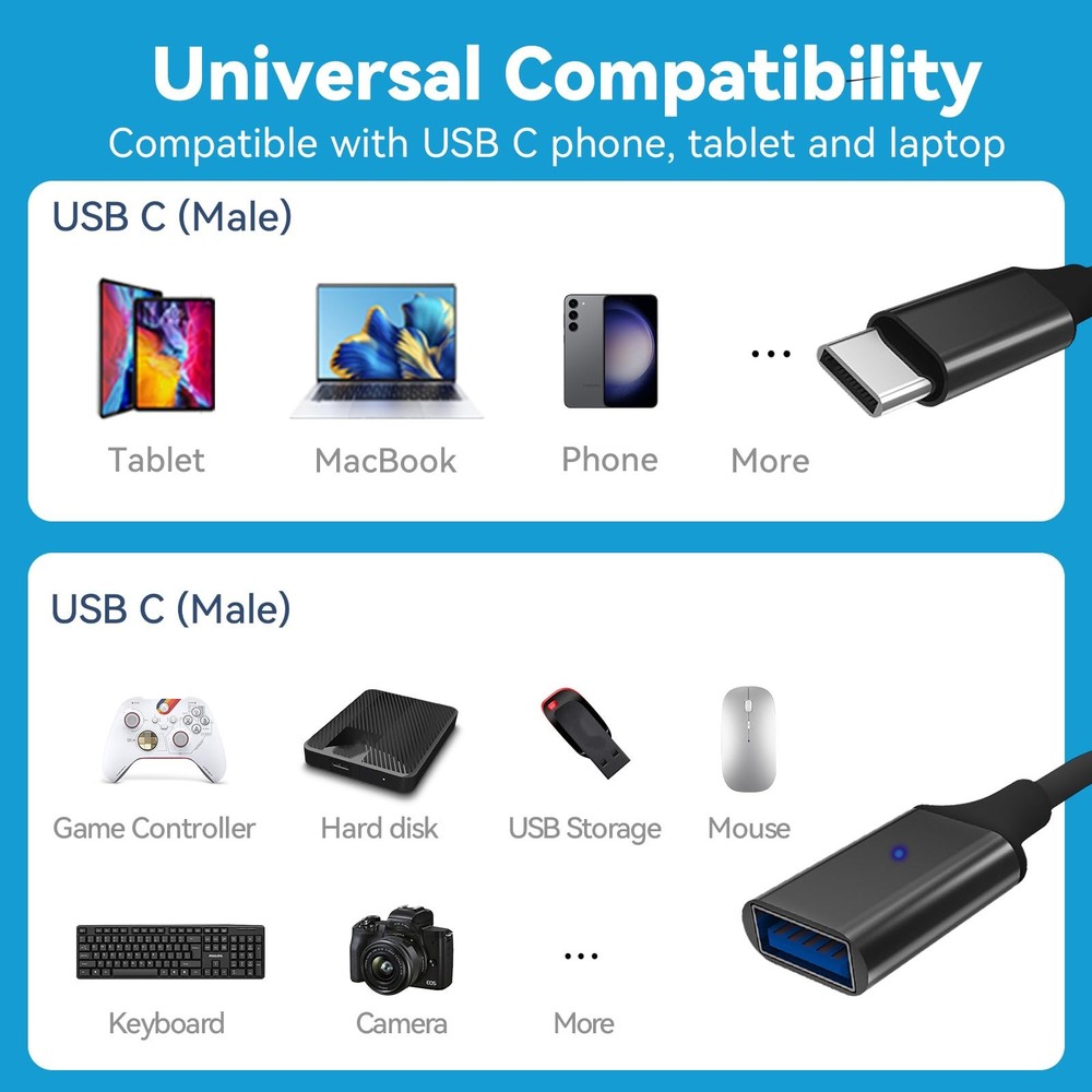 USB C to USB 3.0 Adapter [2 pack], Thunderbolt 3 to USB Adapter OTG Cable for iPhone 15/15 Pro/15 Plus/15 Pro Max, Macbook Pro/Air, Galaxy S20 【USB 3.0 Super Speed Transfer】: Full USB 3.0 super speed data transfer up to 5Gbps, 10x faster than USB 2.0. Transfer files, HD movies and songs to your USB C devices in seconds. 【ON-THE-GO - Plug & Play】: No driver required. Provides a seamless user experience when connecting webcam, mouse, Bluetooth receiver and keyboard. 【Aluminum Body】: Made out of sturdy aluminum alloy, innovative engineering ensures durability and a long life span. 【Wide Compatibility】This is a flexible and durable usb-c to usb adapter. Compatible with iPhone 16, 16 Plus, 16 Pro, 16 Pro Max, iPhone 15, iPhone 15 Pro, iPhone 15 Pro Max, iPhone 15 Plus, iPad Air 5/4, iPad Mini 6, iPad Pro 12.9 6/5/4/3, iPad Pro 11 3/2/1, MacBook Air M2 15in/13in, MacBook Air M1, MacBook Air Retina 13in, msung Galaxy Note8 S9/S9 Plus S8/S8 Plus, Compatible with New Macbook Pro,LG G6 G5 V20 and other USB Type-C devices. 【Indicator light】: This OTG adapter has a working indicator light, which can facilitate you to check the working status of the equipment better and more convenient in the use of the project. 【What you get】: We provide this USB C OTG Adapter with Five years Warranty and 24/7 customer service, if you have any questions,we will resolve your issue within 24 hours.