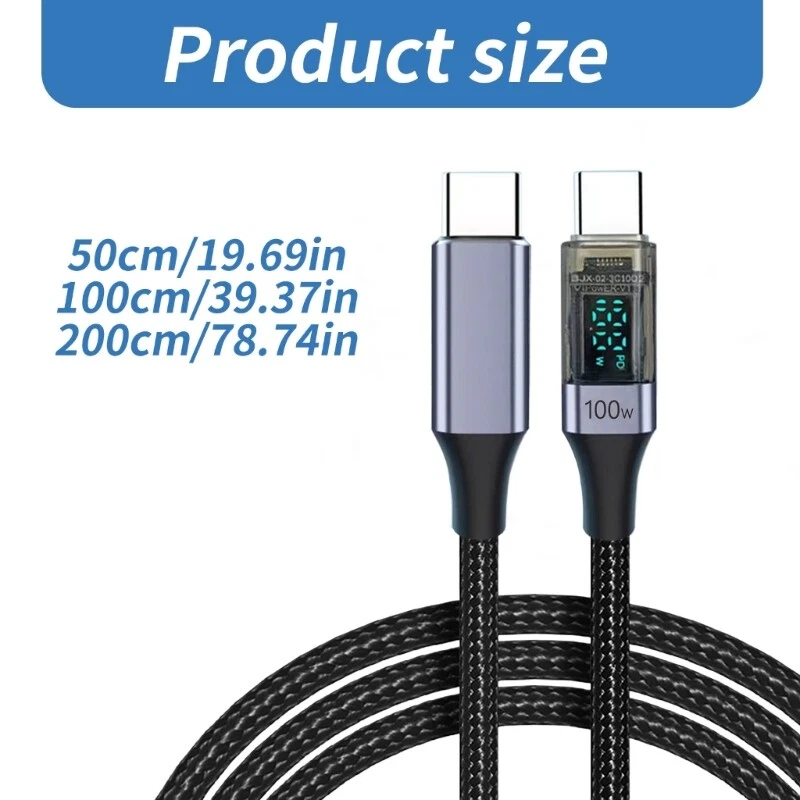 Features: Experience future of charging with our Type C Fast Cable, to power up your devices rapidly and efficiently. Featuring a dynamic power display, this USB C PD100W cable supports 60W intelligent charging and 480Mbps data transfer rates, crafted with durability nylon and robusts aluminum alloy. Suitable for individuals, digital nomads, and professionals who require reliability, highly speed charging for their laptops, smartphones, tablets, gaming consoles, and headphones. Whether you're working, attending a business meeting, or simply relaxing home, this digital display charging cable keeps your gadgets power in any setting. Simplify your digital life with our user friendly fast cable, ensuring that stay connecting is always within reach without compromising on speed or performances. Specifications: Material:Nylon+Aluminum Alloy Length:Approx.50cm/19.69inch,100cm/39.37inch,200cm/78.74inch; Option Type:50cm Cable,50cm Gray Cable,50cm Green Cable,100cm Cable,100cm Gray Cable,100cm Green Cable,200cm Cable,200cm Gray Cable,200cm Green Cable, Support PD100W Fast Charging and 480Mbps Data Cord; Package Includes: 1pc USB C Cable note: Please allow 1mm errors due to manual measurement. Due to the differences between different monitors, the picture may not reflect the actual item color.