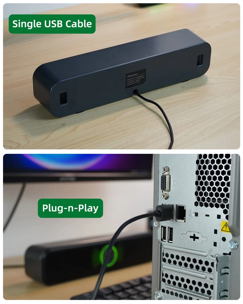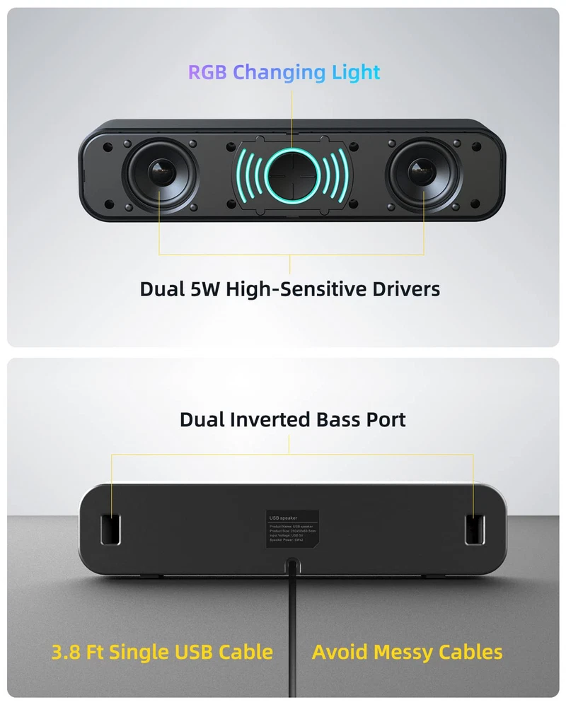🔊Stereo Loud Sound -- Dual 5 Watt high-sensitive drivers to bring you high-quality stereo loud sound. 🥁Enhanced Deep Bass -- Dual inverted bass port on the back boost low-end frequencies to make the beats hit even harder. 🎛️Digital Volume Knob -- Built-in Audio Decoding Chip makes it possible to synchronously control the volume of your computer system through the digital volume knob. 🔌Avoid Messy Cables -- No need for 3.5mm audio jack, only the single USB cable can feed both audio and electric power to the computer speaker. 💻Universal Compatibility -- Compatible with Windows, macOS, Linux and Chrome OS PC, laptop and desktop computer.