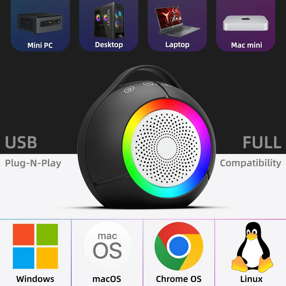 DYNAMIC RGB LIGHT RING: Built-in RGB lights will sync to the beat of the music to create a pulsing colorful light show. ASTONISHING SOUND: Breathtaking ultra-clear sound and deep bass are delivered by a hi-fidelity speaker driver and extra-large sealed cavity. LOUDER SOUND VOLUME: Upgraded to 2.6inch larger super-magnetic driver, increase the sound volume by at least 30% than other USB speakers whose driver size is only 2inch. EASY TOUCH CONTROL: There are 4 touch buttons on the top for you to easily control the RGB light and sound volume. USB PLUG-N-PLAY: NO static noise, NO driver software and NO 3.5mm headphone jack. Just plug in the USB cable, then the speaker will bring you crystal-clear loud sound. FULL COMPATIBILITY: This USB computer speaker is a great external speaker for your Windows/macOS/Chrome OS/Linux laptop, PC and desktop computers.