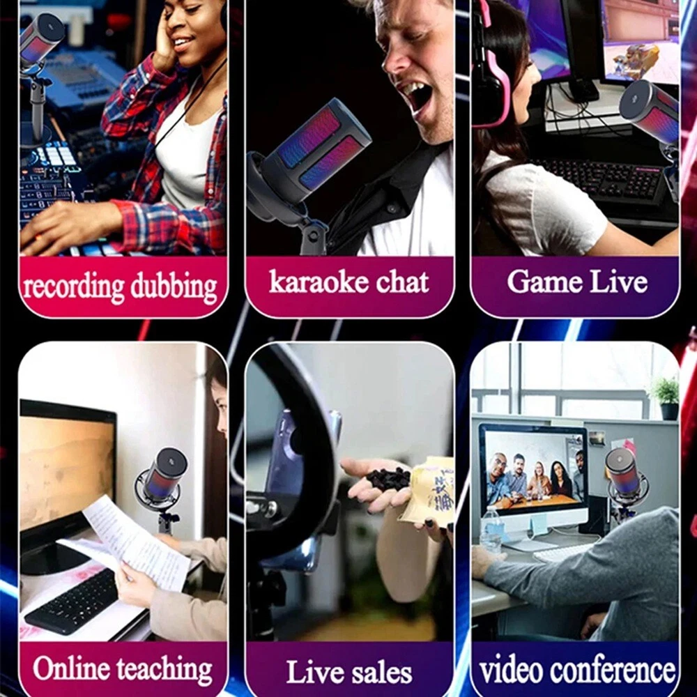 USB Condenser Metal Microphone Professional Recording Streaming with RGB1860 Plug and play USB Microphone that connects to your computer or laptop directly via USB port(work with for and Vista, XP), recording your music or podcast effortlessly. A recording microphone with dedicated gain volume knob itself, for louder output and more sensitive, your voice would be heard crispy and clean when using it in gaming , skyping or voice recording. USB microphone with cardioid pattern for recording, captures your voice clearly and smoothly when the microphone is pointed towards you. The rugged body and robust stand come in handy when you're dubbing or broadcasting for . The microphone can be connected to the 3.5mm headphone jack, allowing you to directly monitor the sound in real time without delay, or listen and record at the same time. -touch mute button on the top allows you to prevent audio accidents, as much as you can control Material: Metal+Plastic colour: Black Package Contents: 1 x Gaming RGB Microphone