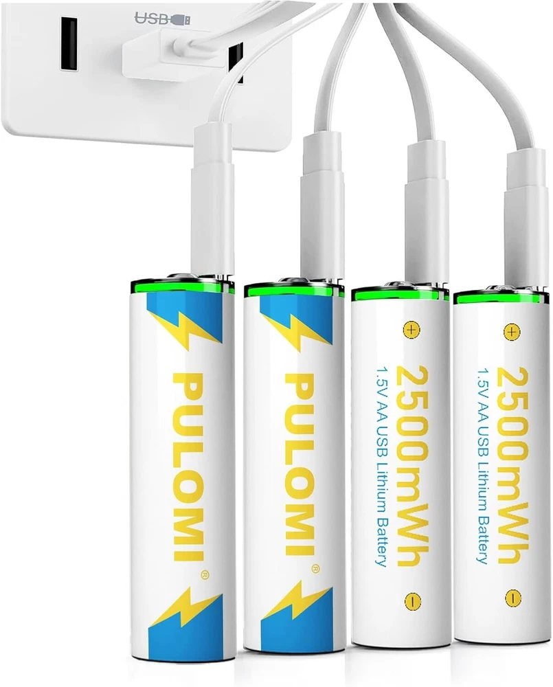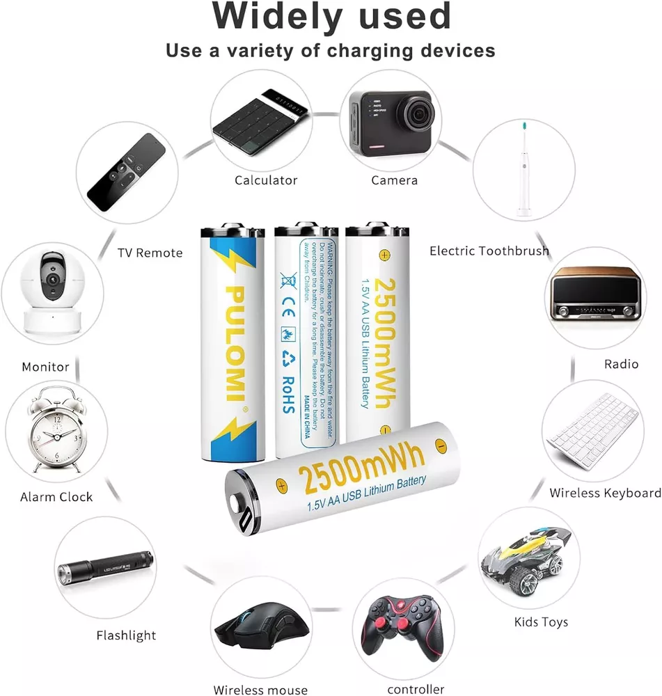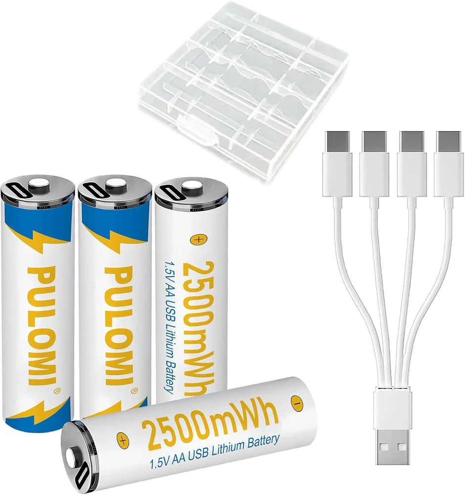 USB Lithium ion Rechargeable AA Battery, High Capacity 1.5V 2500mWh Rechargeable AA Battery, Fast Charge, 1200 Cycle with Type C Port Cable, Constant Output (4 Pack) Product Details Brand: PULOMI Voltage: 1.5 Volts Battery Cell Composition: Lithium Manganese Dioxide Recommended Uses For Product: Indoor/Outdoor Model Name: N3BT-AA4 SWITCH TO RECHARGEABLE: Stop wasting money on standard alkaline AA batteries! Switch to our rechargeable lithium batteries for the same great performance. Reuse the batteries repeatedly. Be eco-friendlier and more cost-effective Type C USB CHARGING: Directly plug a Type C USB into the input for quick and easy charging. Use the included cable to connect simultaneously connect 4 batteries to any USB power supply. Connect to an AC adapter, power bank or computer, and fully charge in around 1.5 hours. Long lifecycle will allow over a 1200 uses LED INDICATORS: When charging, the green LED will blinks and then LED remains on once it is fully charged. Conveniently see the charging status of each battery LARGE CAPACITY: 2500mWh capacity provides sufficient power for a wide range of products. Perfect for controller, keyboard, mouse, toys, calculator, toothbrush and much more