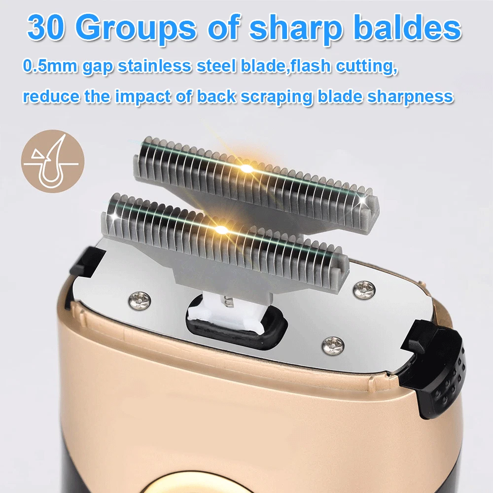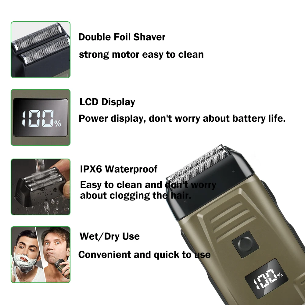 Specifications: Best for hair, beard, stubble, shaved head bump free shaving and super close shaving clean up hair and neck lines for smooth finish cord/cordless shaver shaper a great tool for an extra-close shave on the neck,face and all around the hairline 100-240V voltage,50/60Hz Cord/cordless work powerful and quiet rotary motor gold titanium hypoallergenic foil for irritation-free shaving 2 blade cutting shaving system 600mAh Lithium-ion battery LCD display, charging reminder, battery power percentage reminder contains travel lock function, press and hold the switch for 3 seconds, the machine will be locked, if unlocked, do the same operation USB Line charger model Package Included: 1* T rimmer 1* Protective cover 1* C harger 1* Cleaning brush 1* Manual INSTRUCTIONS FOR USE : 1. Men whose skin is sensitive or easily irritated by shaving, or who suffer from a skin allergy, should test one section on the leg or arm before using the shaver. 2. Remove the protective cover and turn on the unit to start shaving. Hold the shaver at a right angle to the area of your face that you want to shave and run the single shaving foil carefully along your skin. Tip: In general, we recommend that you shave against the direction of hair growth, as this is the best way to trim the hair. Pull your skin tight, with your fingers in inaccessible areas, to achieve optimum results. 3. Do not push the shaver on the skin too hard as it could cause irritation, make the shaver warm and prevent a perfect shave. 4. Please note that it takes 2 to 4 weeks for your skin to adapt to a shaver, so please do not change shaving instruments in this period of time. 5. If hair is longer than 1/32” begin by cutting the hair down first with a trimmer, then use shaver for a smooth close finish.