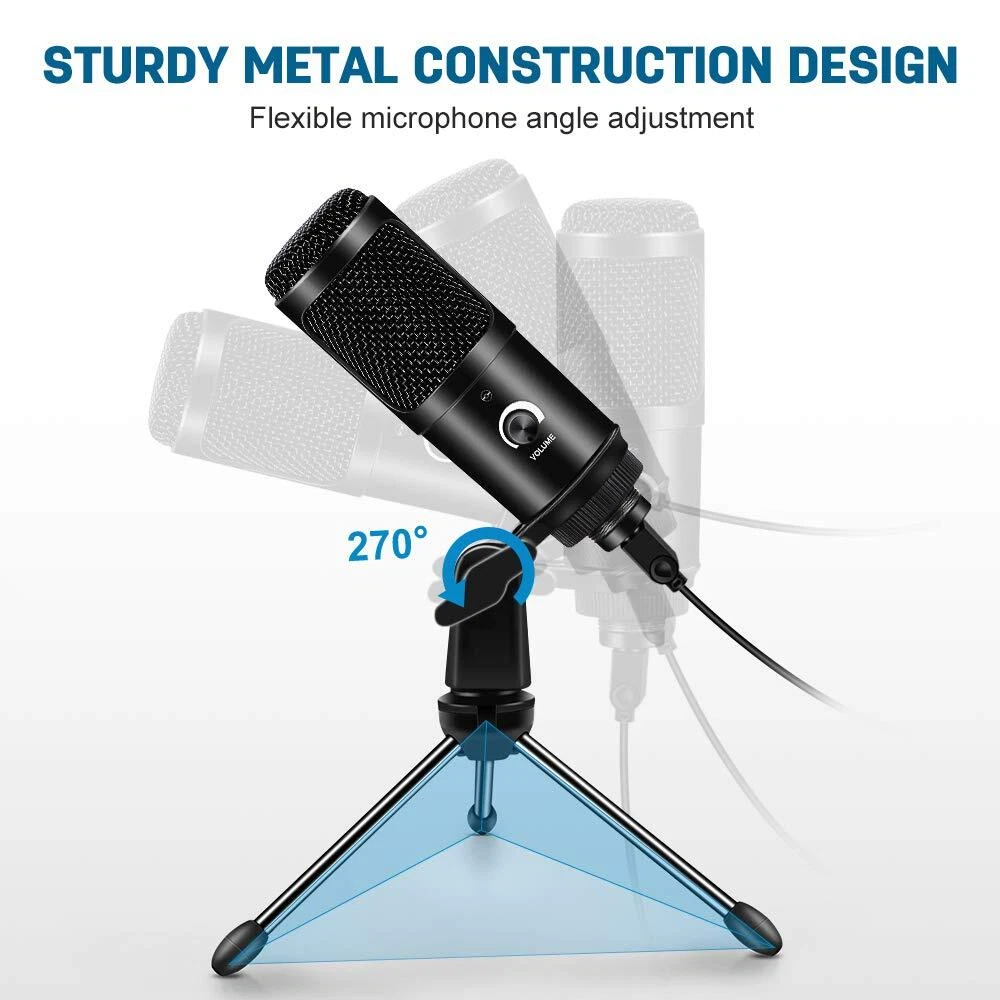 USB Microphone for Recording. Plug 'n Play Cardioid Computer Microphone with Stand. Improve the Sound of Your Audio Projects. Ideal for gaming, singing, meeting, voice recognition software, Skype, and web casting, etc. Plug & Play - Simply plug it into your computer's USB port with the included USB cable, calibrate it with your operating system, and you're ready to record. Use Tips: 1.Please set up manual if your computer can not recognize the microphone. Go to your desktop and right-click the sound icon (the that looks like speakers) and select “Recording Devices” and then the steps by steps.There are also a operation guide in user’s manual. 2.Please try to plug the usb mic on the back of your computer instead of the front usb port Sometimes the usb port with comparatively low power supply can not be boost . Package Lists: 1× USB Condenser Microphone 1× Adjustable Tripod Stand 1× User Manual 【Excellent Sound Quality】: The usb condenser microphone built-in professional sound chipset , 192KHZ/24BIT sampling rate, which lets you capture the clear and smooth sound when you are zoom meeting or gaming. Cardioid pickup pattern that suppresses unwanted background noise and captures the clear sound in front of the microphone.Note: Do not place the USB mic too close to the wall and power supply. 【Plug and Play】:This professional recording USB microphone for computer is rather easy to use(4.6 Feet USB Cable, Long enough for most daily use), simply plug the mic into your computer’s USB port. No drivers required, the ease of use makes this a great option for beginners to start recording or streaming.(★Note: Before use, you can debug to ensure a satisfactory sound. For the debugging method, please refer to Figure 5.) 【Robust Stable Structure Design】:Solid sturdy metal construction design pc microphone with stable tripod stand is convenient when you are doing voice overs or livestreams on . Easy to adjust, You just need to unfold the tripod and attach it to the PC microphone, 270-degree flexible design provides adjustment of any angle or position as you want to fit your needs for your perfect voice.The usb cable, microphone and tripod are detachable, compact and portable. 【Smart volume Knob Design】:mini microphone for pc with additional volume knob itself has a louder output and is more sensitive, your voice would be heard well enough when gaming ,skyping or voice recording. 【Wide Application】:This usb mic for pc can fully with Windows / macOS / Linux / PS4, which can be used for gaming, recording,podcasting, voice over, live streaming, online teaching, and online meeting, Skype, Discord, Yahoo, Recording, Google Voice Search and Steam, meet your all daily needs.