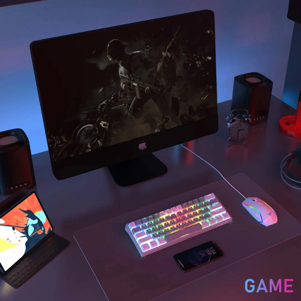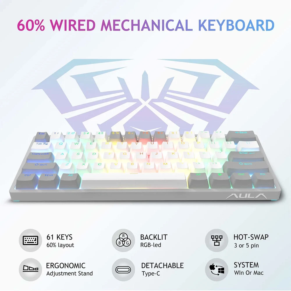 F3261 RGB effect USB Mini Mechanical Gaming Keyboard Red Switch 61 Keys Wired Separated detachable cable for Mac Windows AULA F3261 RGB 61Keys Mechanical Keyboard 61 key wired mechanical keyboard 29 RGB backlight modes side RGB lighting Hot swappable keyboard compatible with 3-pin or 5-pin switch Ergonomic design 3 Levels of Ergonomic Height Anti-Slip Foot Mat System Win