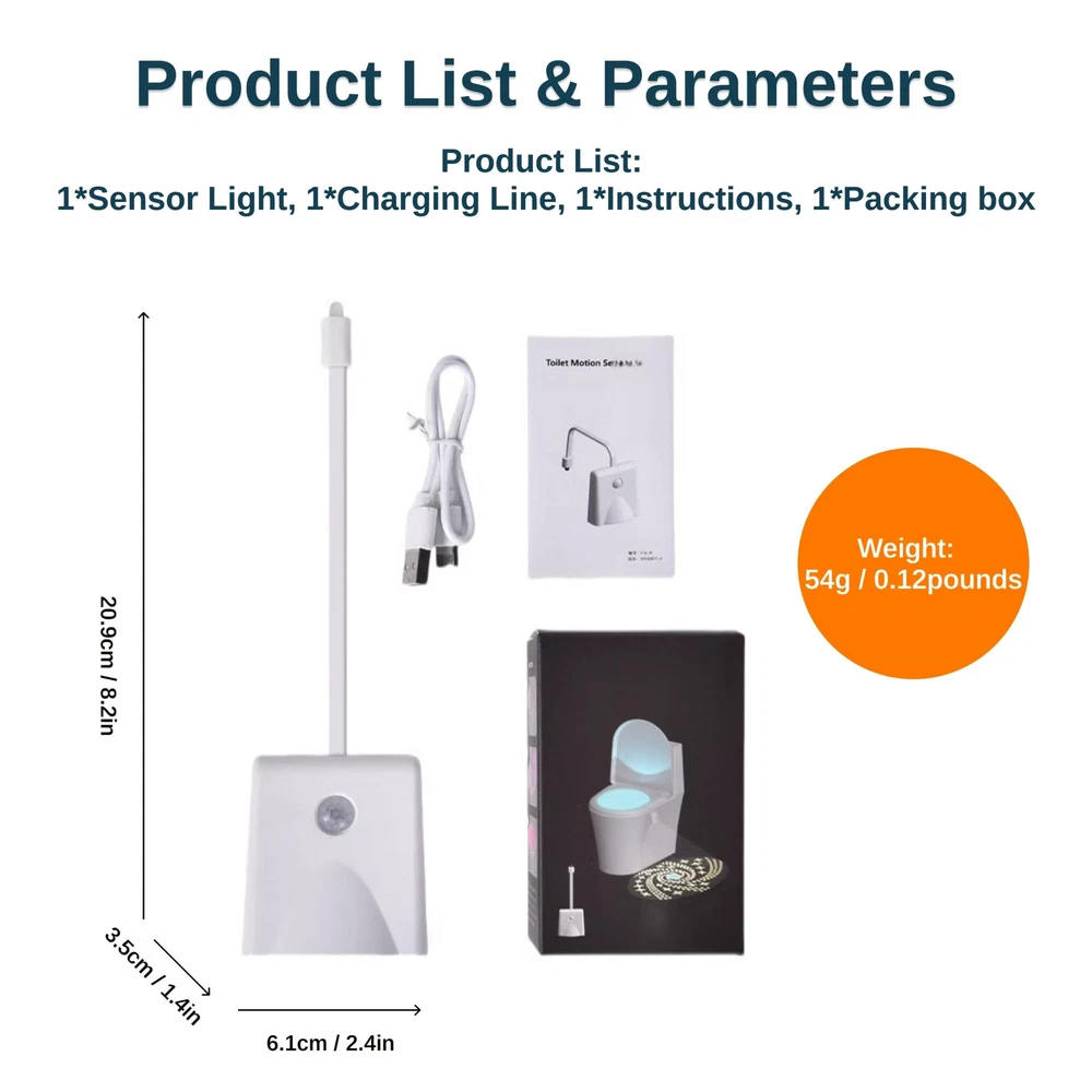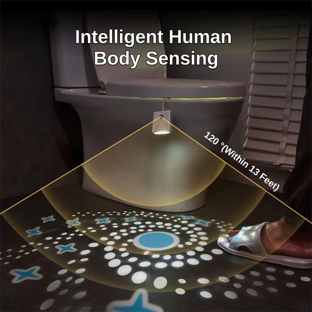 【Design】Toilet lights upgraded RGB 16 Colors changing LED and adds the starry sky projection function at the bottom, will show you a beautiful starry sky world on the floor, not only makes the toilet more colorful and more funny, but it can also stimulate children's desire to explore and imagine, and can prevent the elderly and children from being tripped in the darkness. 【Charge】The toilet light motion sensor has a built in 500 mAh rechargeable battery that can be charged using the included Type-C charging cable, eliminate the trouble of changing batteries frequently. It can be used for up to 2 months after being fully charged, which can maximize the battery life. Say goodbye to stumbling in the dark or disturbing your sleeping partner by turning on the bathroom light. 【Sensor】The toilet bowl light with high quality light sensor and motion sensor. When you are within 13 feet, the light will automatically light up are on and keep it for up to 90 seconds of lighting, and then automatically turn off. Light sensing allows it to work only in the dark. So, when you go to the bathroom in the middle of the night, you don't need to turn on the light. 【Use】The power button has 2 functions.Short press can colorful light gradient/fixed color. Long press can turn off the power.Our illuminated toilet light is suitable for all sizes of toilets. Its flexible arm can be easily adjusted and secured to the side of the bowl, resting securely on the rim beneath the seat. Plus, it's IP68 Waterproof,making it easier to clean, splash proof, and our toilet light can be cleaned with most household cleaners. 【Gift Choice】This toilet night light is a terrific present idea that will make your children's and friends impressed. At the same time, it is an excellent method to give as a present for any occasion, including Christmas and birthdays.