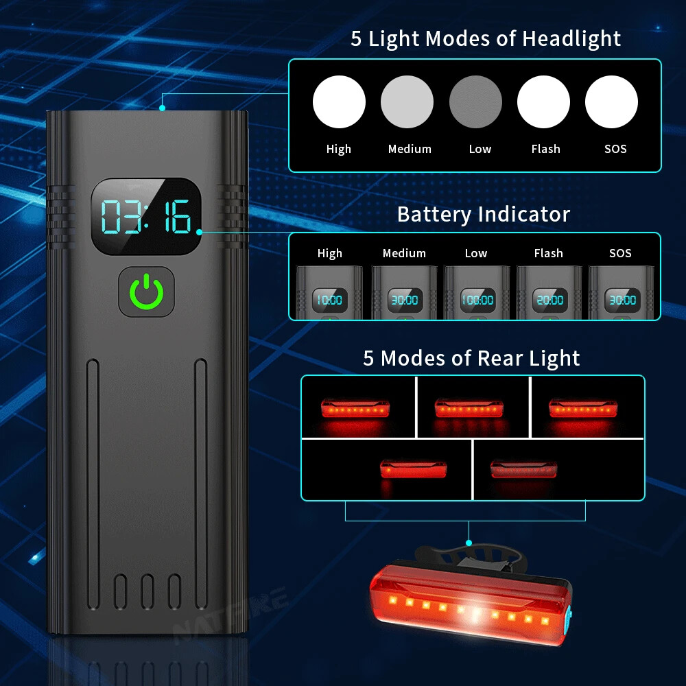 10000mAh 5000LM MTB Bicycle Front Light Bicycle 8*LED Front Bike Light Headlight Bike Accessories USB Rechargeable 【SUPER BRIGHT BIKE LIGHT TO KEEP YOUR SAFE】 Adopt of extra bright LED bead for Natfire bike lights set, provide 1000-5000 lumen and up to 300+ feet beam length ,You will be shocked and amazed at how bright it is! Five light modes- High, Medium, Low, strobe and sos light modes. so you can see clearly no matter on a urban road or on a dark lonely country road, excellent to keep you safe at night. 【Battery Power Display & 360° Rotation】 The Bicycle Front Light is designed with battery power display function, showing the actual time of remaining battery, which can help you to master the usage and charging time more conveniently. Moreover, the natfire mount bracket for the headlight is 360° rotatable, allowing you to adjust to the suitable angle according to actual situation during cycling. 【USB RECHARGEABLE】 Save your time to replace batteries every week. Never waste money on batteries anymore. Natfire bike light and optional red rear light come with a CHARGING CABLE that charges from your computer, power bank or any device with a USB port. 10000mAh large capacity and Built-in intelligence IC can prevents overcharge or over discharge and extend battery life. This bike headlight has a Runtime of 7+ hours on the highest setting and Runtime of 15+ hours on the lowest setting. (Depends on the battery you choose, larger battery capacity, longer runtime) 【WE THINKING MORE FOR YOU】 No any tools needed making it easy to install. Easily mounted and secured with the adjustable mount. it's very easy to take off from bike for recharge and prevent thieves for stealing, portable design for rechargeable bicycle headlights.Water resistant rated to IPX5 - Protected against splashing water from any angle. Product Parameters Model: Bicycle Light NKX8D Pro - Digital Display Version Material: Aluminum shell Mode: 5 Light Modes Working voltage: 3.7V Waterproof: IPX5 Range: About 100-300M Battery:10000 mAh Surface craft: Abrasion resistant anodizing Tips: If you do not use it for a long time, please charge it every three months. Do not shine into the eyes. Keep away from flammable and explosive materials. Waterproof grade is IPX5. Do not immerse the bicycle light in water. Place the bicycle lights correctly. Keep out of reach of children to avoid accidents.
