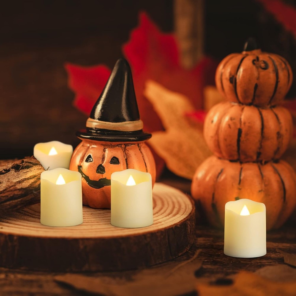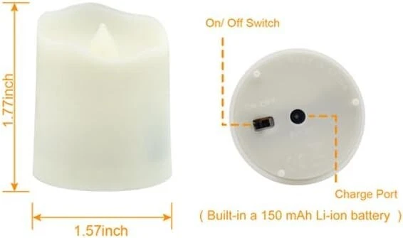 Rechargeable candles:The votive tealights come with 2*USB charging cable.You could charge all 12 candles at the same time. You needn't replace the batteries and it is not only save your money, but also can save energy and environment-friendly, reduce waste.Each charge can provide you with 20 hours of lighting time. Long Battery Life & Safe:Each tea light candle has a built-in rechargeable lithium battery,makes the flameless candles could be recycle used for a long time. The realistic tea lights create no fire and dripless wax, safe for indoor bedroom home decorations.When not in use, the appearance of the tea light is white. Easy to Use:These led votive tealights are convenient to operate with a remote.You can control these tea lights turn ON/OFF, flicker mode (fast or slow ), brightness of light (increase and decrease) and timing mode (6 hours timer, automatic cycling every 24 hours) by a remote control(battery include) Bright Soothing & Realistic:These electric fake candles look like real candles without the danger, no fire risk, no unpleasant scents or waxy odors, and no drips.They are safe to use around children and pets. The soft light makes your eyes look more comfortable and creates a romantic atmosphere for you. Package & Service: You will receive 12PCS rechargeable tea lights candles, 1 user manual,2 usb charging cable, 1 multifunctional remote control. Each led tea light candle has thoroughly tested, if the flameless led candles has any problem.Please feel free to contact our customer service, we will try our best to help you.