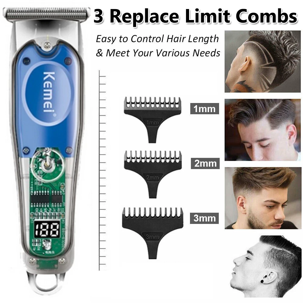 Features: 1.Powerful long-life motor cute-angled moving blade, sharp and durable 2.Considerate and digitalized smart LCD display for reminder, 6300rpm/min strong power, Less than 55dB low noise, Once charging can last up to 240-min working time 3. Newly designed acrylic material, sturdy and durable, with a beautiful appearance, you can directly see the internal parts. Specification : Brand : KM-1926 Machine Weight : 267g Machine Size : 18*4.5*3cm / 7*1.7*1.2 Inch Voltage : 100-240V Frequency : 50/60Hz Batt e ry : 8W Charging Time : 3 Hours Using Time : 240 Mins Power Supply : USB Recharge Cleaning Way : Cleaning With Brush Package list : 1 * Hair clipper 8* Limit combs (1.5/3/4.5/6/10/13/16/19mm) 1 * USB cable 1 * Cleaning brush 1*Manual