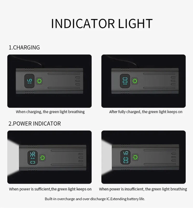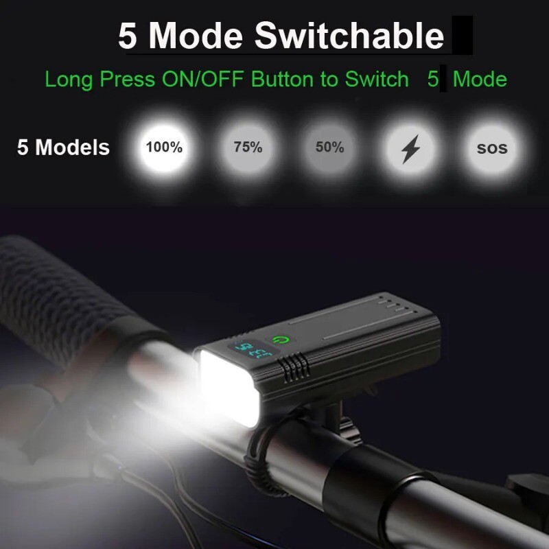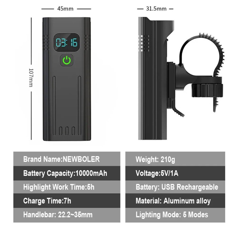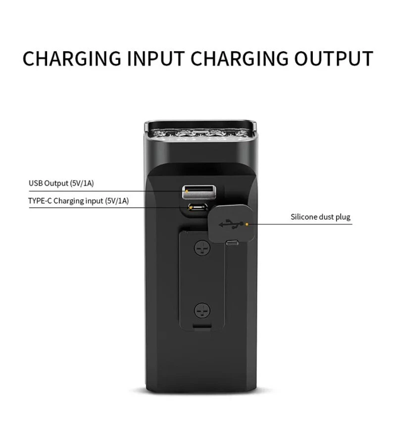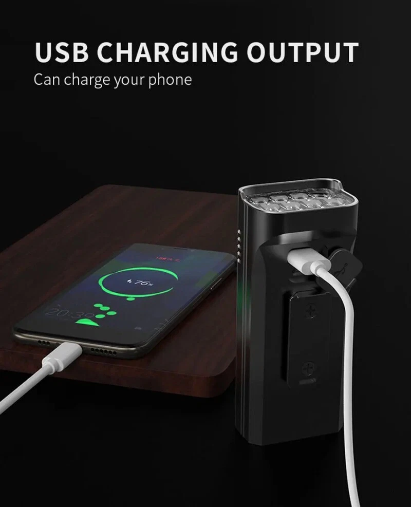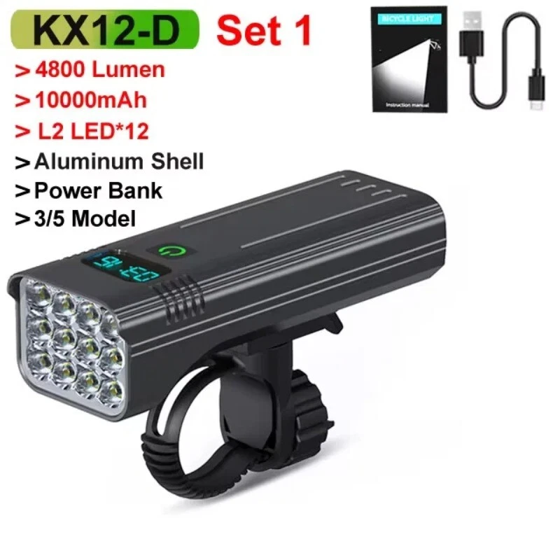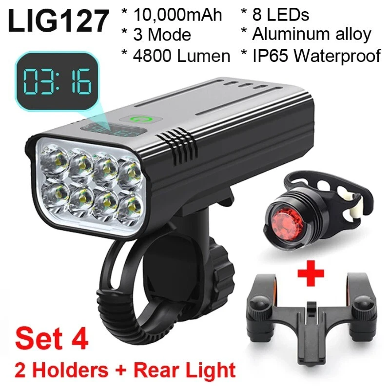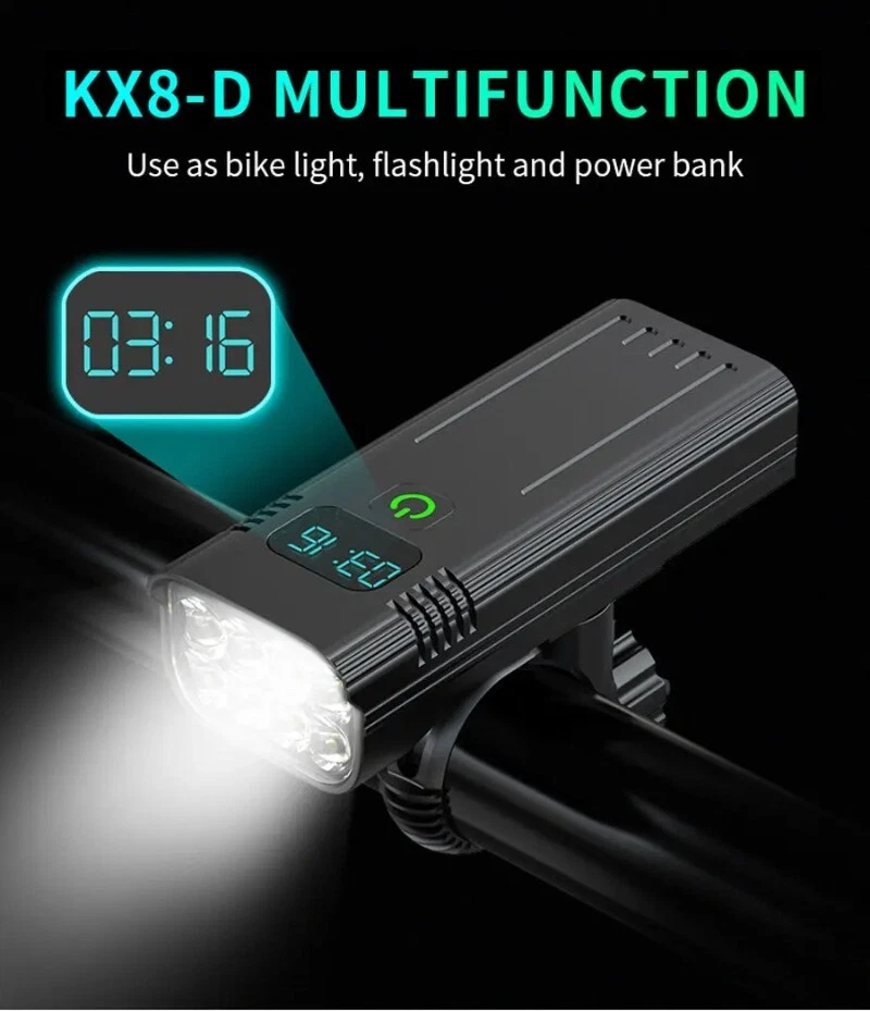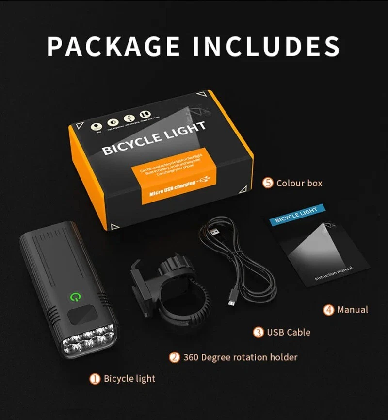 Features: 1. The most cost-effective bicycle light.it is very bright, the maximum output is about 4800 lumens, and the 8 LED lights cover a wide range, allowing you to ride at night to see wider and further areas 2. Built-in 10000mAh battery (8 LED), USB output can be used as a power bank, can charge your mobile phone, 5V/1A USB Rechargable battery, 3. Made of high-quality aluminum alloy casing, it has excellent impact resistance, heat dissipation and corrosion resistance, not only for USB charging port, but also for the entire lamp,Safe use, even in rainy weather. 4. More durable and adjustable Holder,could hold your handlebar very secured, no need worry it will fall off. Suitable for 20~36.5mm handlebars, easy to install ,no tools required. 5.5 Switchable mode, free to switch according to your needs.The headlight also has a flashlight function that can be used in various scenes, such as cycling, camping, night fishing, walking. Parameters of Front Light: Irradiation distance: above 500 meters LED: T6 Bracket: 360 degree rotation bracket Charge and discharge protection: built-in overcharge and over discharge IC. Extending battery life Size: 115mm (Lengh), 45mm(width), 31.5mm(height) 5 switch Mode: Highlight / Low Light/ Mid Light / Strobe / SOS Working voltage: 3.7V Product color: Black LED color temperature: 7500K Product Material: aluminium alloy Switch type: Button Switch on lamp Super Bright 4800 Lumens T6 LEDs. The range reaches 300 meters. At a speed of 30 km/h. It can guarantee to illuminate 50 meters ahead. Use as a Power Bank Charge your phone and other electronic devices 3/5 Mode Switchable Long press ON/OFF button to switch 3/5 mode Input/output port USB output 5V/1A Micro input 5V/1A USB Rechargeable Used as a flashlight It can also be used as a flashlight In the case of high-power use. The flashlight will heat up. Please do not use strong light when holding it. Avoid hot hands Power indication When it is charging. the red led light up. When it is fully charged. green led light up When it is turn on. The green led lights up. When it's power less than 20%. The red led light up 360° rotatable holder Fit For 20~36.5 handlebars 120° Floodlight Package list Parameter of Taillight Light Bead: COB LED Power: Power by CR2032 Replaceable battery Durable Time: Up to 48hrs Material: Aluminum alloy Battery: 2* CR2030 Button Battery Waterproof : IPx5 Weight: 40g