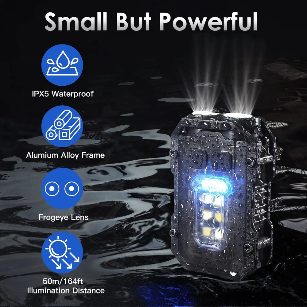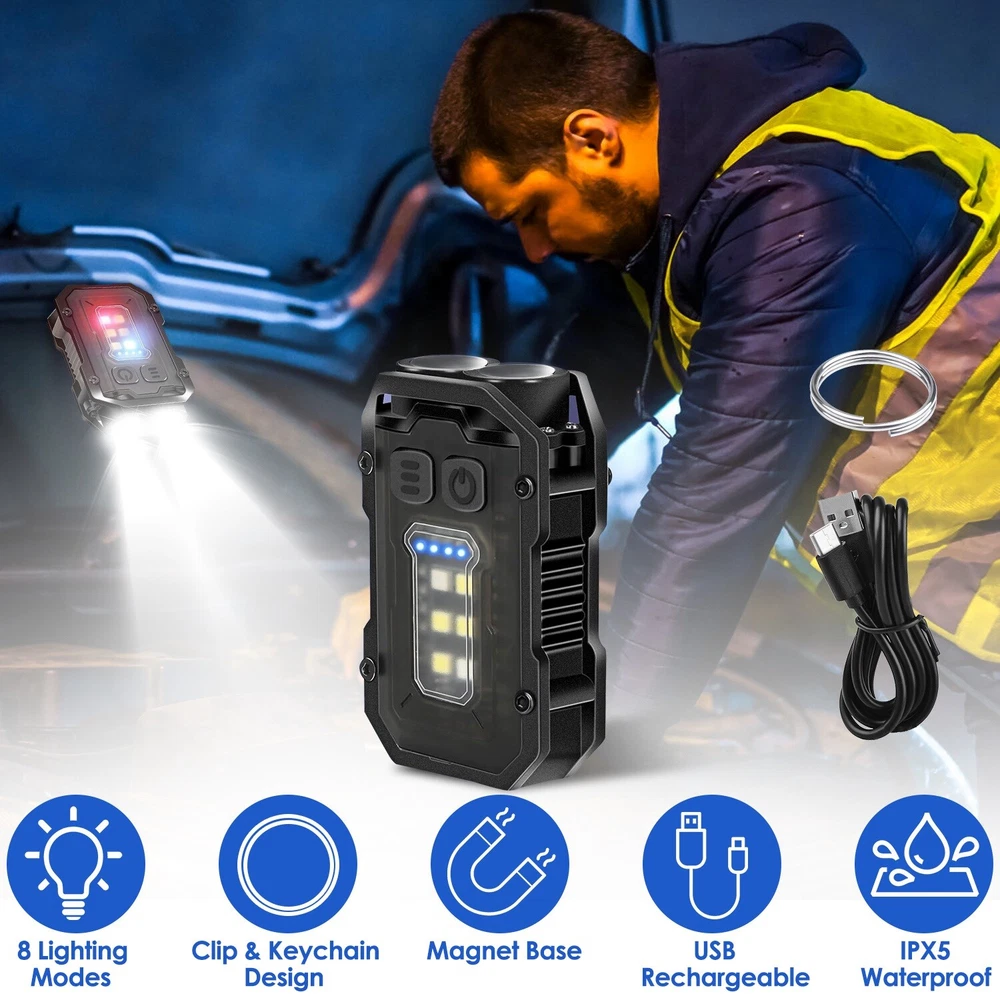 Featured Item Product Detail Image Gallery Product Description Overview: Do you often do repairing work? Then our mini pocket keychain flashlight is definitely for you! Our min LED flashlight is endowed with 4 main light modes and 4 side light modes that cater to a variety of scenarios, such as hiking, camping, hunting, climbing, night walking, backpacking, caving, auto repairing in particular! The magnet base can firmly attach to various metal surfaces like car hood or steel shelf while repairing. What’s more, both the back clip and keychain enable the LED work light to be so mini that perfectly fits your pocket for convenience. Keep standby for up to 8 hours after charging for 3 hours.USB rechargeable and IPX5 waterproof. A helpful assistant and thoughtful gift for repairers, adventurers, and even little boys! Features: 4 LED Main Light Modes: Our mini pocket keychain flashlight featured with 4 main light modes,including Single Strong Light,Single Weak Light,Double Strong Light and Double Weak Light. An extremely helpful assistant that caters to a variety of scenarios,such as hiking,camping,hunting,climbing,night walking,backpacking,caving etc.. 4 COB Side Light Modes: Our EDC flashlight also provides 4 side lighting modes(White Strong Light/White Weak Light/Red Light/ Red-blue Flashing Light),suitable for reading,emergency and auto repairing in particular. Clip & Magnetic Design: This LED work light has a magnetic base,which can firmly attach to various metal surfaces like car hood or steel shelf while repairing. Our rechargeable keychain flashlight features a back clip that allows you to attach it to belts,tool bags,or tent tops,freeing your hands. USB Rechargeable& Longlasting: Built in 750mAh rechargeable battery,this pocket work light can keep standby for up to 8 hours after charging for 3 hours. The 4 battery indicators and the included charging cable provide much convenience for charging this LED pocket light. Compact & Waterproof: The IPX5 waterproof performance makes this mini keychain flashlight an ideal companion for outdoor use. Its ultracompact size of 1.46x2.28x0.79in enables itself to perfectly fit your pocket. A thoughtful gift for repairers,little boys and adventurers! Friendly Reminder: 1. Please do not use it when it rains heavily. 2. Please do not immerse it into water. 3. Please do not irradiate the eyes or touch the light bead directly in case of hurting your eyes or scalding. 4. Please do not put it under the sun or in thermal environment. 5. Please do not try to detach the electric parts. 6. Please do not toss or hit it in case of the potential damage of light bead or battery. Specifications: Brand: Lakeforest Product Type: LED Keychain Flashlight Color: Black Material: Plastic+Aluminum Alloy Inbuilt Battery: 750mAh Rechargeable Battery(Battery is not for individual sale) Light Source: LED+COB Base: Magnetic Indicator: 25%-50%-75%-100% Waterproof Level: IPX5 Maximum Illumination Distance: 50m/164ft 8 Lighting Modes: *LED Main Light: *COB Side Light: Runtime: *Single Strong Light: 6Hrs *Single Weak Light: 8Hrs *Double Strong Light: 3.5Hrs *Double Weak Light: 6.5Hrs *White Strong Light: 6Hrs *White Weak Light: 8Hrs Charging Time: Around 3-4Hrs Charging Cable Length: 51cm/20.08in Item Size: 3.7x5.8x2cm/1.46x2.28x0.79in Item Weight: 44g/0.1 lbs Package Size: 7.7*2.2*8cm/3.03*0.87*3.15in Package Weight: 70g/0.15 lbs Package Contents: 1 x LED Keychain Flashlight 1 x Charging Cable 1 x User Manual Terms & Conditions Thank you for your business !