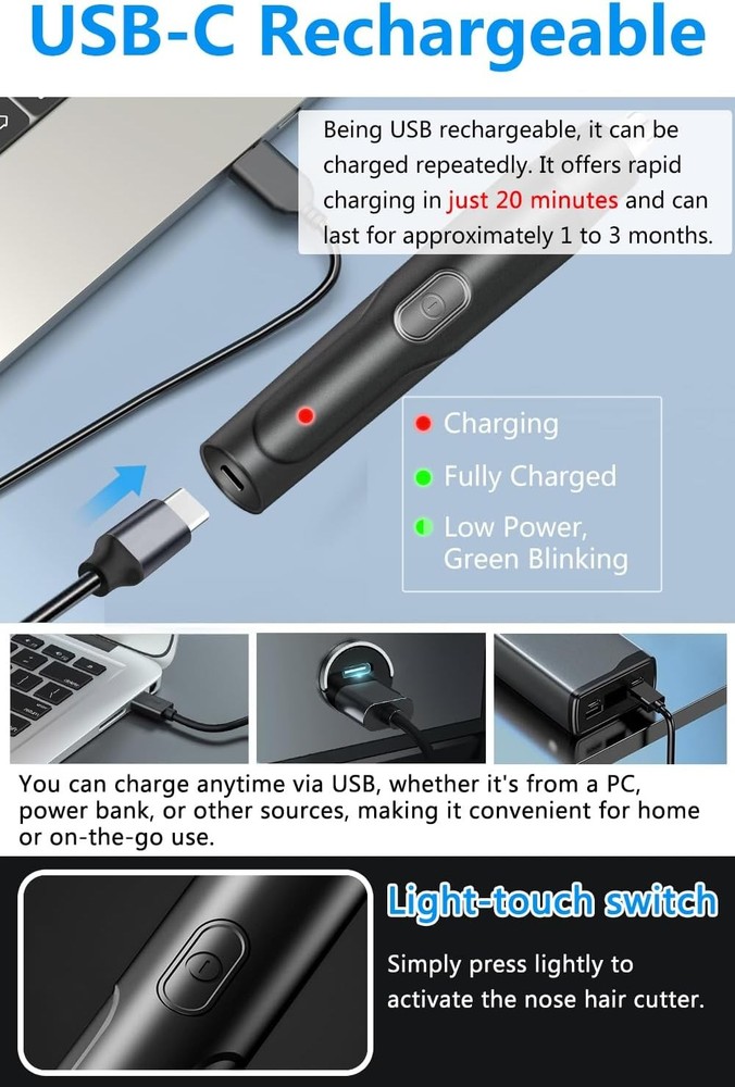 Nose Hair Trimmer, USB Rechargeable, Professional Painless Ear Black Description: Features: 【High-Performance Electric Nose Hair Trimmer】This is a high-performance, mini-sized electric nose hair trimmer, with a length of only 11.2cm. The nose hair trimmer features a simple handle design for easier operation, conforming to ergonomics. Due to its ultra-small size, it's perfect for carrying around. Therefore, it's not only suitable for home use but also convenient to take to the office, on business trips, or when traveling. Additionally, the product is designed for quiet operation, allowing for easy use anytime, anywhere. It is a nose hair trimmer of reliable high-performance that you can trust. 【Quiet Design】The nose hair trimmer features a full copper DC motor, utilizing a high-torque motor that effectively reduces motor noise, significantly decreases energy consumption, and simultaneously improves lifespan. Compared to other nose hair trimmers, this model boasts a 30% reduction in noise. Despite its compact design, the trimmer operates with minimal noise, ensuring it won't disturb others even when used in quiet environments. 【USB-C Fast Charging】The nose hair trimmer utilizes USB-C fast charging, reaching full charge in just 20 minutes, providing 1-3 months of usage on a single charge. During charging, the indicator light displays red, turning green when fully charged. When the battery is low, the green light will blink, signaling the need for timely charging. This nose hair trimmer can be conveniently charged using various devices such as phone chargers (5V), power banks, computers, and car USB chargers. 【Efficient Trimming & Skin Care】This nose hair trimmer is equipped with a three-dimensional design trimming head with a protective cover. Featuring dual blades, it can quickly, safely, and easily handle nose hair from any direction without shaving it all off, preserving an appropriate length to protect the nasal cavity. The scientifically designed head allows for easy removal of the blades using just your fingers, eliminating the need for tweezers or other tools, making cleaning a breeze. 【Package Contents】The package includes the nose hair trimmer body, a cleaning brush, a USB-C cable, a spare blade, and a user manual. If any accessories are missing, please feel free to contact us. If the nose hair trimmer cannot be used upon receipt, please try charging it before use. 【Quality Assurance & Reliable After-Sales Service】We are dedicated to producing superior nose hair trimmers and conduct rigorous quality checks. However, in the unlikely event of any quality issues, we offer reliable after-sales service. If you encounter any quality problems during use, please contact us within one year. We will respond within 24 hours. Providing attentive after-sales service is our goal. SHIPPING: We are always working hard to ensure your package arrives as soon as possible. Please understand that some factors like weather, high postal traffic, and the performance of shipping companies are outside of our control. We offer free shipping to the lower 48 states and ship within 3 business days of payment, usually sooner. We do not accept P.O. Boxes. Please provide a physical address. For shipping outside of the continental USA, we only use eBay's Global Shipping Program. The item is shipped to KY and then sent to the rest of the world. International customers are responsible for all duties and taxes. Continue to check out in order to calculate costs for shipping the item to your country. Messages regarding eBay's Global Shipping Program MUST be directed at eBay EXCLUSIVELY. PAYMENT: We accept payment by PayPal only (Can accept all kind of credit cards). Please pay as soon as possible after winning an auction, as that will allow us to post your item to you sooner. Payment must be received within 3 business days of auction closing. Before buying, please make sure your PayPal and eBay address is correct. If not, please correct it before payment. We have confidence in our products, but if you are not fully satisfied please contact us within 30 days of purchase and you will get full refund of your money. Return the product in the same condition you received it. Please note - return shipping will be paid by the buyer.
