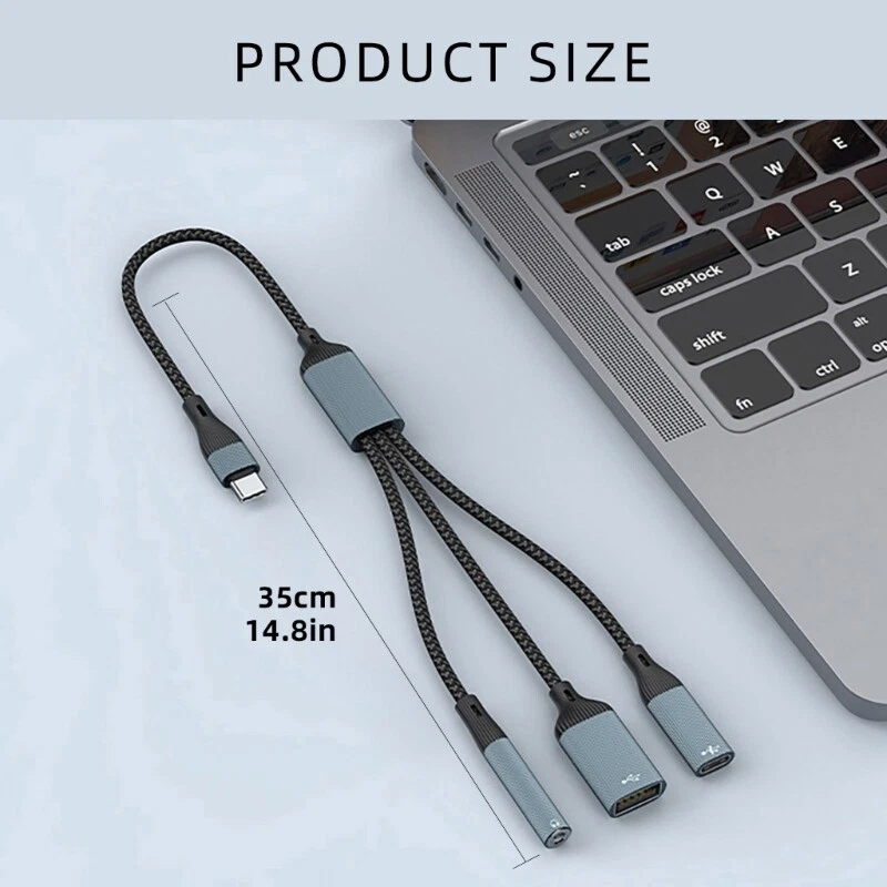 Features: Experience connectivityS with Type C 3 in 1 Adapter Cable, featuring 60WPD fast charging port, 3.5mm Sound transmission, and OTG data transfer capabilities for enhancedS versatility. from nylon, this adapter cable includes Type C female port supporting 60W charging, 3.5mm Sound, and a Type C/USB female port for data transfer, ensuring performances without video transmission support. for individuals, this adapter for laptop users, smartphone enthusiasts, and tablet owners seekings solution for their connectivitys needs. Whether you're home, in office, this adapter cable allows you to external USB devices like hard mouse, and keyboards to laptops, desktops, smartphones, and tablets. Enhances your digital experience with adapter cable, to meet the demands of modern electronic devices while providing efficient and stable Connection across multiple platforms. Specifications: Material: Nylon Total length: 35cm/14.8inch Type C+USB+3.5mm, Two Type C+3.5mm (optional) Package Includes: 1PC 3 in 1 USB Type C Adapter note: Due to the screen setting difference, the item color may slightly differents from the pictures. Please allow slight dimension difference due to differents manual measurement.