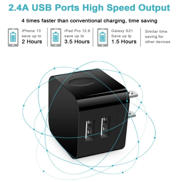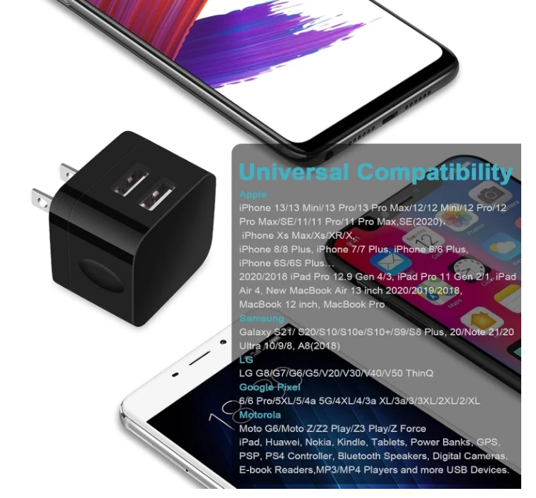 USB Wall Charger,USB Plug,2Pack Flat USB Charger Block Charging Low Profile USB Cube Charger Box Right Angle Plug Adapter for iPad Pro,iPad Mini,iPad Air 1/2/3,iPhone 15 14 13 12 11 Max,Samsung,Pixel Brand VIFIGEN Connectivity Technology USB Connector Type USB Type C Compatible Devices Smartphones, Headphones, Tablets, Game Consoles, Smartwatches Compatible Phone Models iPhone 15/ iPhone 15 Pro/ iPhone 15 Pro Max/ iPhone 15 Plus, iPhone 14/14 Pro/14 Pro Max/14 Max, iPhone 13/13 Pro/13 Pro Max/13 Mini, iPhone 12/12 Pro/12 Pro Max/11/SE/X/XR/Xs/Xs Max/8/8 Plus/7/7/6/6S/Plus, iPad, iPad air/ 2, iPad mini 4 3 2 1, iPad Pro; iPad Pro 12.9 (2021/ 2020/ 2018), iPad Pro 11 inch, iPad Air 4th, iPad Mini 6th; Samsung Galaxy S24 Ultra 5G, S24, S24 Plus, S23 Ultra 5G, S23, S23 Plus, S22 Ultra 5G, S22, S22 Plus, S21 Ultra, S21, S21 Plus, S20 FE 5G, S20 Ultra, S20, S20 Plus, S10, S10e, S9, S8, Note 20 Ultra, 20,10, 9,8, Galaxy A15 5G, A54 5G A55 A35 A14 5G,A13 5G A23 5G,A53 5G, A24 A34 A73 F54 F34 A12,A32, A03s,A04s, M34 M14 M52,M42, Z Flip 6 5 4 3, Z Flip, Z Fold 6 5 4 3 2; Google Pixel 8a, 8 Pro, 8, 7a, 7 Pro, Pixel 7, 6a, 6 Pro, Pixel 6, Pixel 5, Pixel 4 XL, Pixel 4, Pixel 3 XL, Pixel 3; Motorola Moto G 5G Plus,G Stylus 2022,G10,G9 Play,G8,G7 Plus/Play/Power,G6, Edge,Edge X30,Edge S30; LG G9 ThinQ G8 G8X G8S, G7 ThinQ, G6, G5, Stylo 4, V20, V30, V35, V30S, V40 ThinQ Plus; OnePlus 10 Pro,9RT 5G,9 Pro,9,9R,8T,8 Pro and more.iPhone 15/ iPhone 15 Pro/ iPhone 15 Pro Max/ iPhone 15 Plus, iPhone 14/14 Pro/14 Pro Max/14 Max, iPhone 13/13 Pro/13 Pro Max/13 Mini, iPho… See more Included Components 2 USB wall charger adapters Special Feature Fast Charging, Short Circuit Protection, Lightweight Design, Automatic Off, Travel Color Black Input Voltage 240 Volts (AC) Mounting Type Wall Mount About this item 【Downward Plugs Design】The flat usb wall plug is flat to the wall and the USB ports are oriented vertically in the bottom, so the cables can go downward instead of straight out of the wall, right angle usb plug reduces the chance of breaking off and makes cords easier to get out of way. 【Perfect Size】These low profile usb wall chargers are slim and sleek. Because of where the ports are, it can easily fit into wall outlets behind furniture without kinking your cables, which is very helpful at your house to solve your space issue. The side grooves of usb cube help you to plug it in as you side your hand down between the wall and your nightstand. Makes things so much more convenient! 【Dual Port Charger】Flat USB wall charger having two USB plug ins available allows you to charge your iPhone and iPad at high speed simultaneously. 90 Degree outlet adapter charging cube output is 5V/2.4amp (not support Qualcomm Quick Charge 3.0), 3X times faster than conventional charger box, more time saving. 【Universal Compatibility】This iPhone charger block fits for iPhone 15 Pro Max/15 Pro/15 Plus/15, iPhone 14/14 Pro/14 Pro Max/14 Plus, 13/13 Pro/13 Pro Max/13 Mini,12,11,SE,Xs Max/Xs/XR/X,8 7 6 6S, iPad, Samsung Galaxy S24 Ultra S24 S24+ S23 FE A15 5G A14 A54 A13 A25 A34 A24 A23 A53 A03s A04s S23 S22 S21 S20 S10e S10 S9 S8 Plus,Note 20 10 9, Google Pixel 8a 8 Pro 8 7a 7 Pro/7/6a/6/6 Pro/5 XL/5/4 3 2 XL, OnePlus 9 Pro 9 8 7 6T 6 5 3 2, LG G8X G8 G7 V50 V40 V35 V30s G9, Moto, and all USB plug ins. 【What You Get】Comes with 2 Packs USB wall charger adapter (Black), great for sharing with your families and friends. . We offer FREE shipping on all orders! . We ship within Five business days of payment, usually sooner. . We use a selection of shipping services such as UPS, FedEx, USPS etc. . We only ship to the lower 48 states, no APO/FPO addresses or PO Boxes allowed. . Local pickups and combined shipping options are not provided at this time. . Your satisfaction is a wonderful reward for our efforts. Please assist us by leaving a positive review if you feel pleased with our service. . In the event that you encounter any difficulties related to your order, please do not hesitate to reach out to us directly through the Messaging system on the Ebay platform. Kindly consider opening a COMPLAINT or a RETURN REQUEST as a last resort, only after all other possible measures have been attempted and we have been unable to provide you with assistance. . We will get in touch with you within 24 hours and make every effort to ensure your satisfaction. . Please rest assured of our service quality.